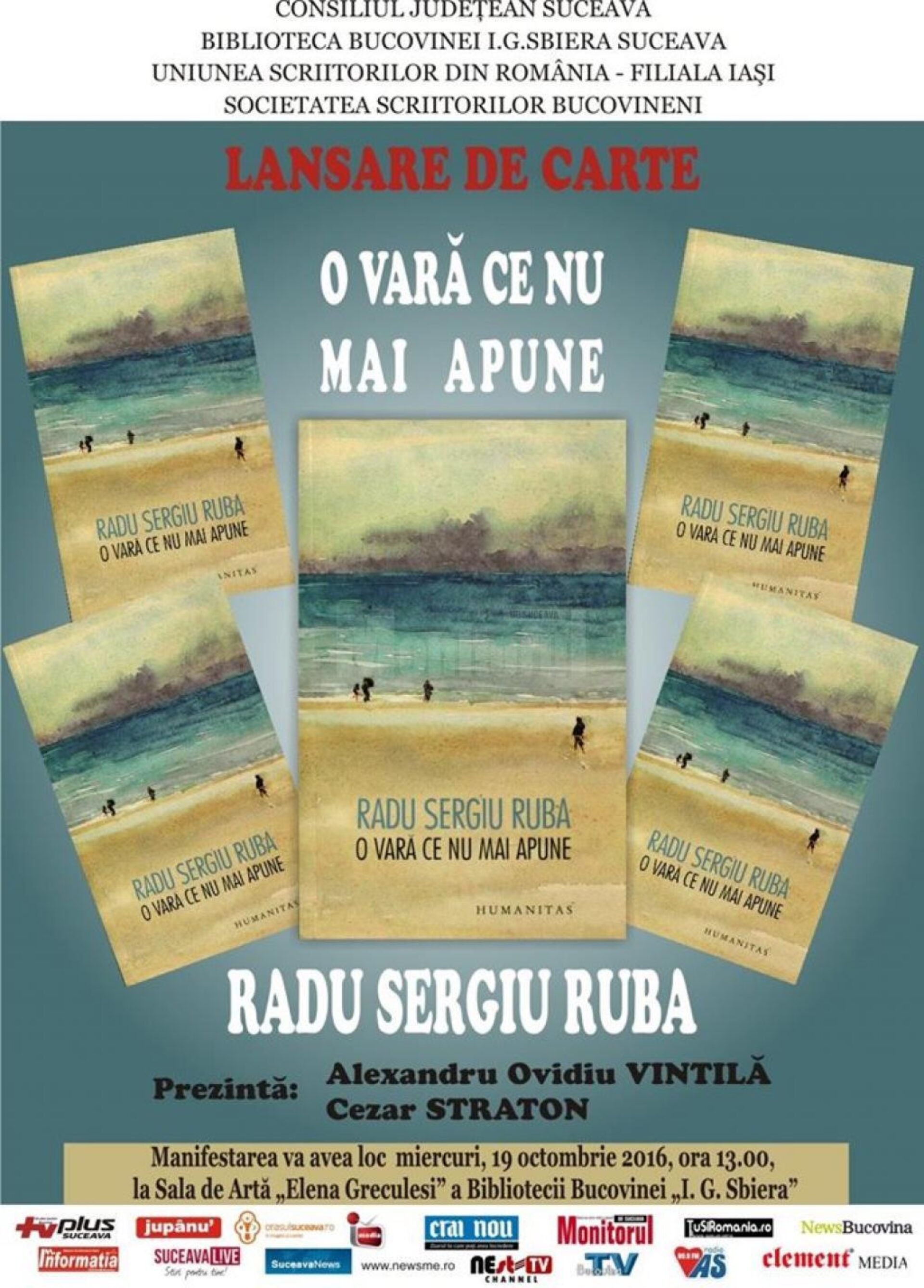 Consiliul Județean Suceava, Biblioteca Bucovinei „I.G. Sbiera”, Uniunea Scriitorilor din România – Filiala Iași și Societatea Scriitorilor Bucovineni organizează miercuri, 19 octombrie a.c., la ora 13.00, în Sala de Artă „Elena Greculesi” a bibliotecii publice sucevene, lansarea volumului „O vară ce nu mai apune”, autor Radu Sergiu Ruba. Prezintă scriitorii Alexandru Ovidiu Vintilă și Cezar Straton.