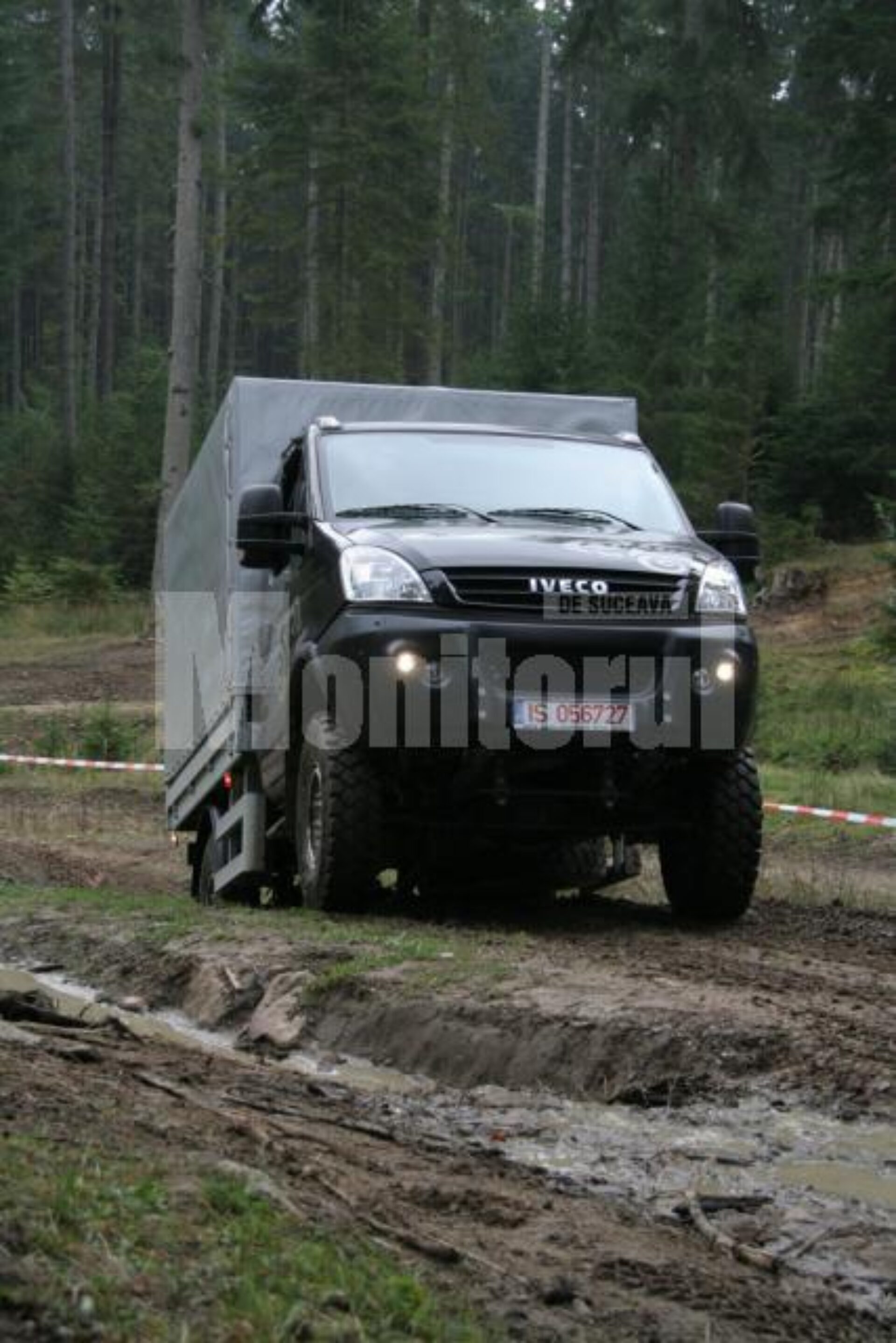 La finalul săptămânii trecute, dealerul regional autorizat Iveco, Romil Service, a organizat la Frasin o sesiune de drive test în teren accidentat cu modelele 4×4 ale producătorului de autovehicule, mai exact modelele Daily 4×4, Trakker și Masiff. Locația aleasă a fost pensiunea „Inima Bucovinei” din Frasin, traseul pentru drive test fiind unul extrem de dificil, mai degrabă pentru profesioniștii off-road-ului. Autovehiculele testate au făcut față cu brio unor obstacole naturale greu de depășit, dificultatea fiind amplificată și de faptul că mai tot timpul s-a urmat albia unui râu secat dar și de pantele ce au ajuns la o înclinație de până la 45 de grade. Cele trei vehicule testate s-au dovedit a fi foarte utile pentru trasee mai dificile și pot avea aplicații diverse, în domeniul protecției civile, în activitatea pompierilor, pe șantiere de construcții. Daily 4×4, util pentru teren accidentat și alunecos Primul model pus la dispoziția celor prezenți la eveniment de Romil Service a fost modelul Daily 4×4, ce reprezintă o extensie de gamă în segmentul de piață cu masa maximă autorizată cuprinsă între 3,5 – 5,5 tone, disponibil atât în versiunea cabină simplă (2+1 locuri), cât și în versiunea cabina dublă (6+1 locuri). Ambele configurații de cabine sunt echipate cu motorul de 3.0L, 176 CP, având distribuție cu 4 supape pe cilindru, doi arbori cu ax cu came în cap și sistem CommonRail de generația a 2-a. Transmisia integrală permanentă, cu repartiția cuplului de 32% pe axa față și 68% pe axa spate, s-a dovedit foarte utilă în traseu, în abordarea pantelor dificile. Cutia de transfer are două opțiuni, rapoarte în condiții off-road și rapoarte în condiții on road, conducătorul auto având opțiunea de a selecta rapoarte “normale” sau rapoarte “de sarcină”, opțiuni utile când se dorește scoaterea autovehiculului din situații delicate. Diferențialul blocabil longitudinal se selectează doar în condiții de deplasare pe teren accidentat sau drum alunecos cu aderență scăzută.