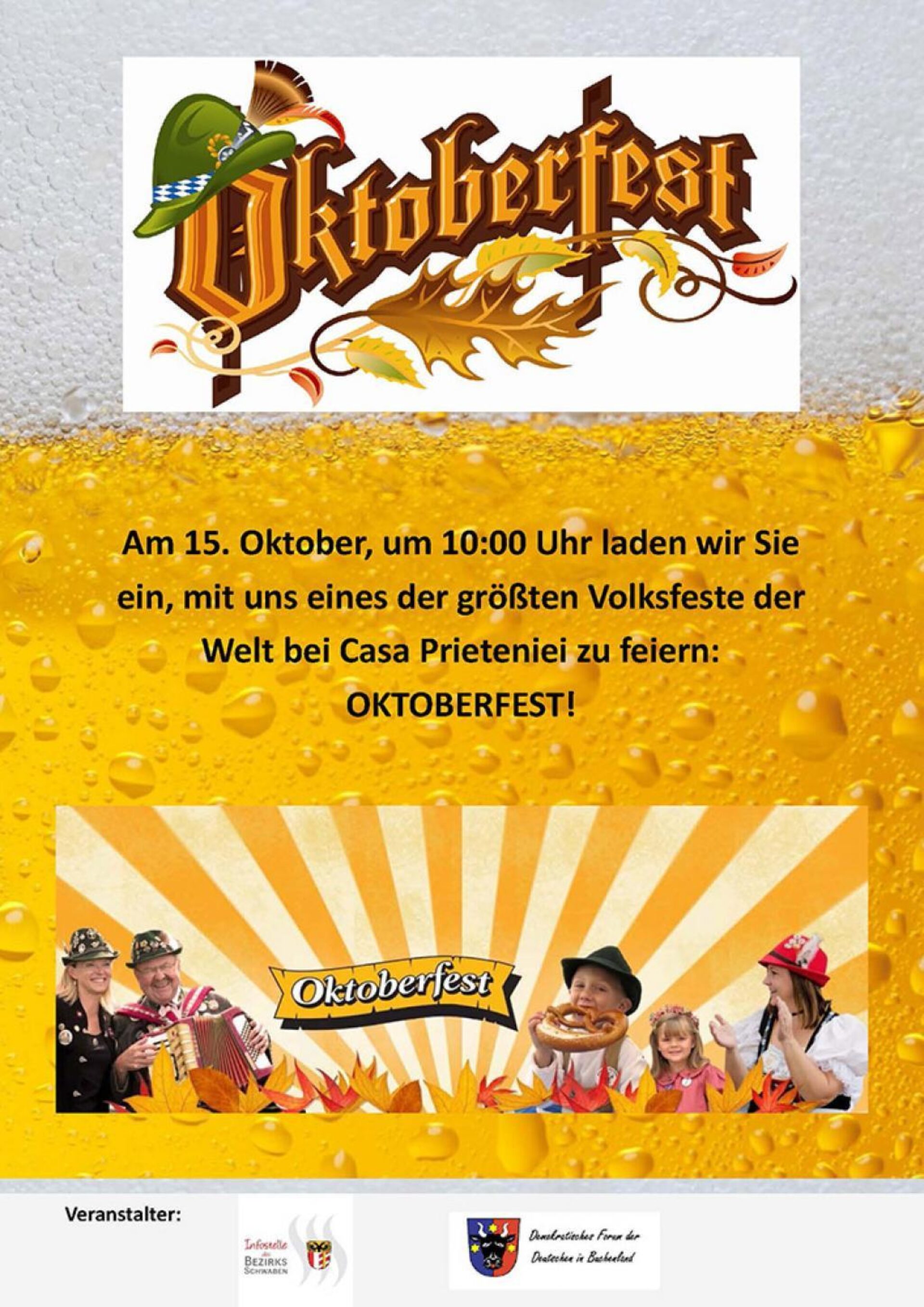 Biroul Informațional al Regiunii Schwaben, din cadrul Casei Prieteniei Suceava, în colaborare cu Forumul Democrat al Germanilor din Bucovina, organizează sâmbătă, 15 octombrie a.c., începând cu ora 10.00, „Oktoberfest” – unul dintre cele mai mari festivaluri ale berii din lume, care are o tradiție de aproape 200 de ani în Bavaria (Germania).