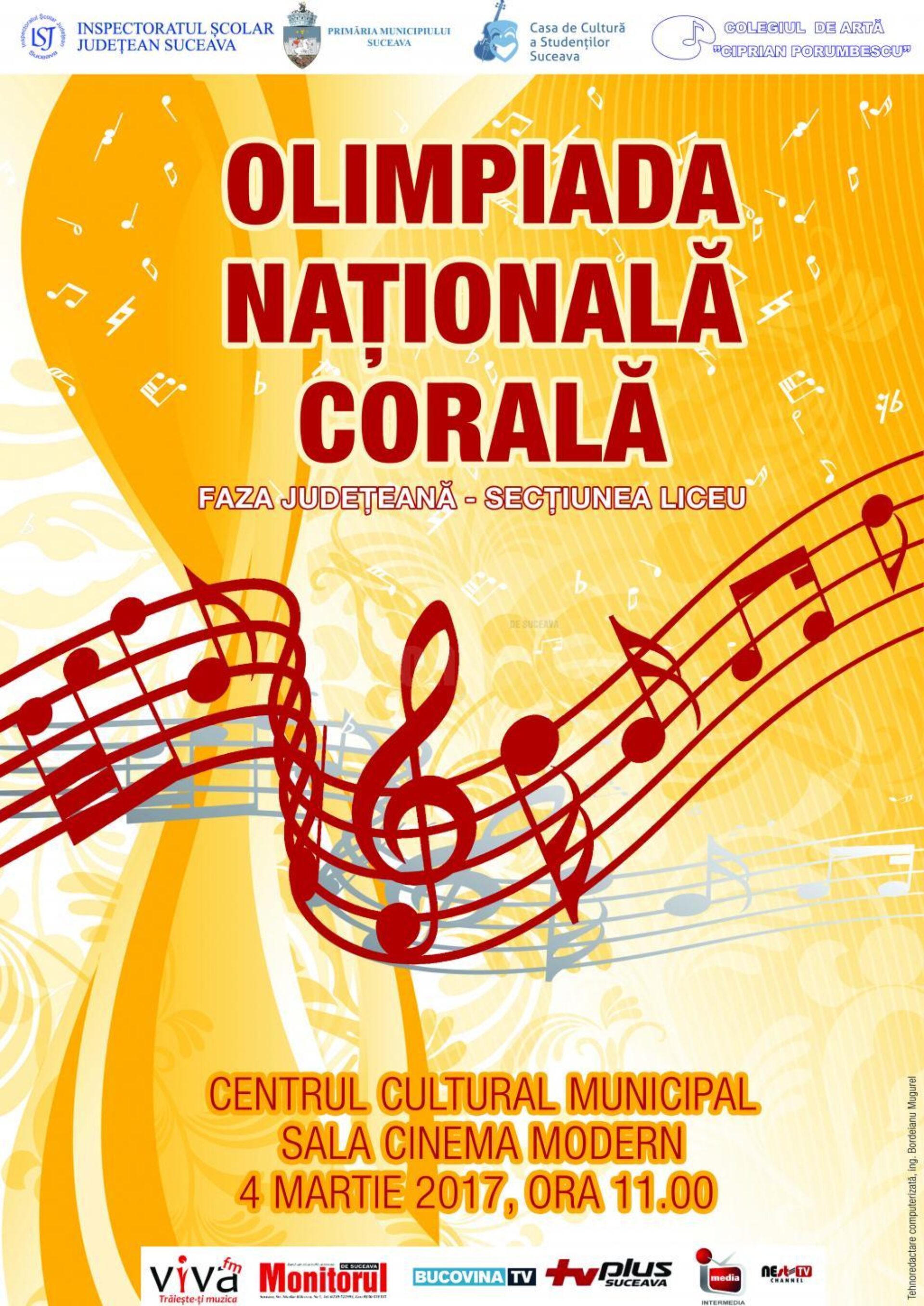 La Sala Modern – Centrul Cultural Bucovina din municipiul Suceava va avea loc sâmbătă, 4 martie, între orele 11:00 – 15:00, Olimpiada Națională Corală – faza județeană, în vederea selectării ansamblurilor corale ce vor reprezenta județul la Olimpiada Națională Corală – faza zonală, organizată la Botoșani, pe 31 martie 2017.
