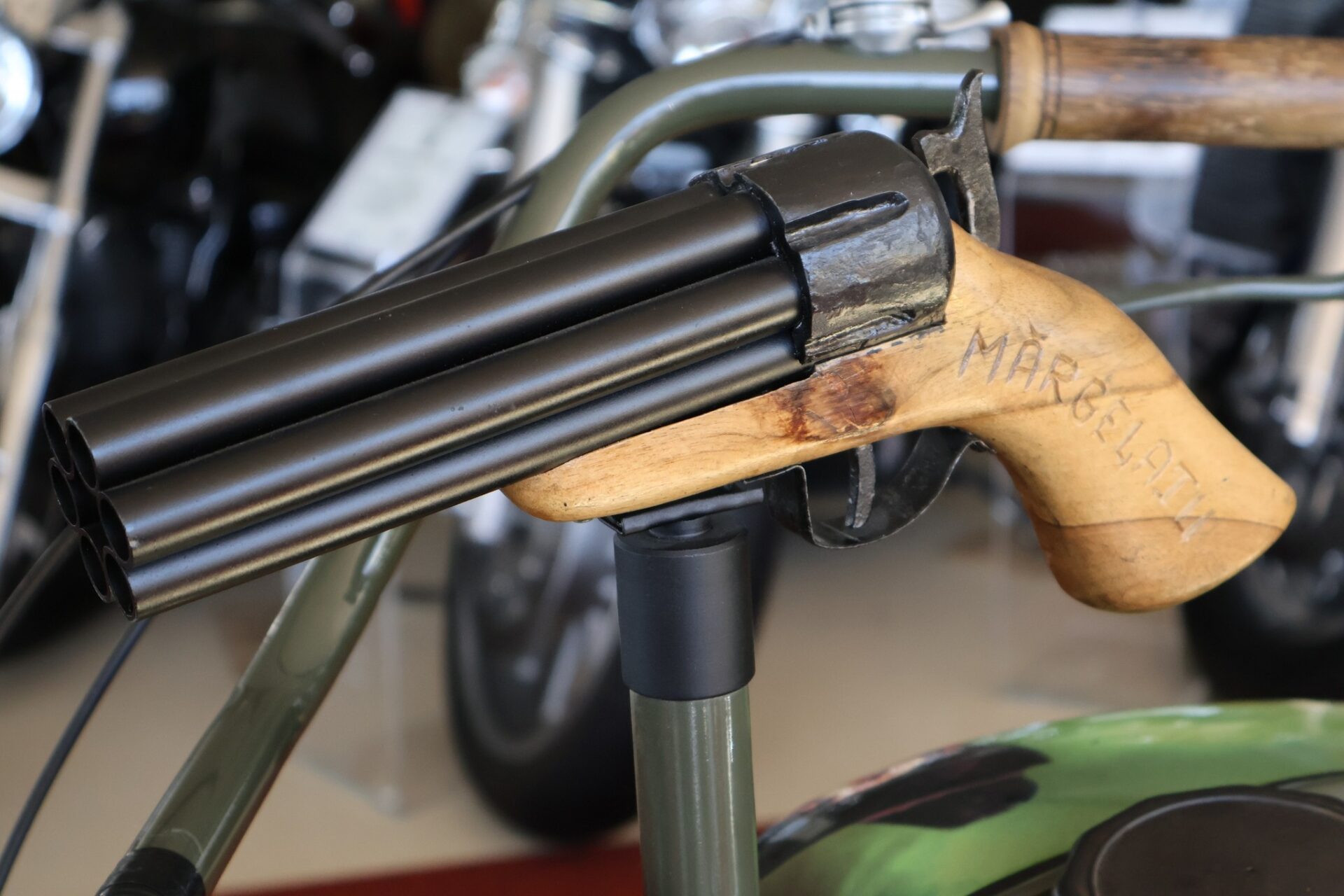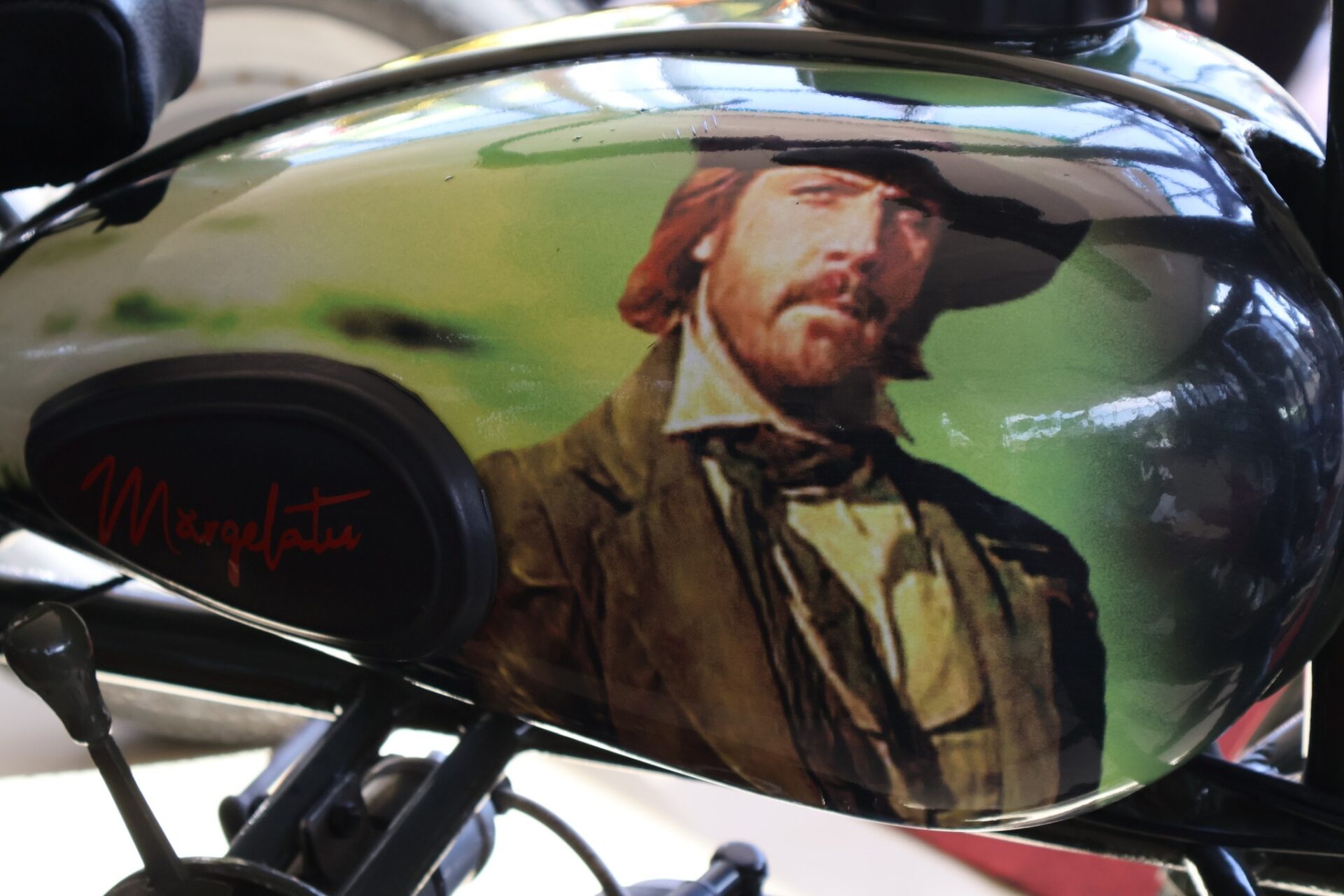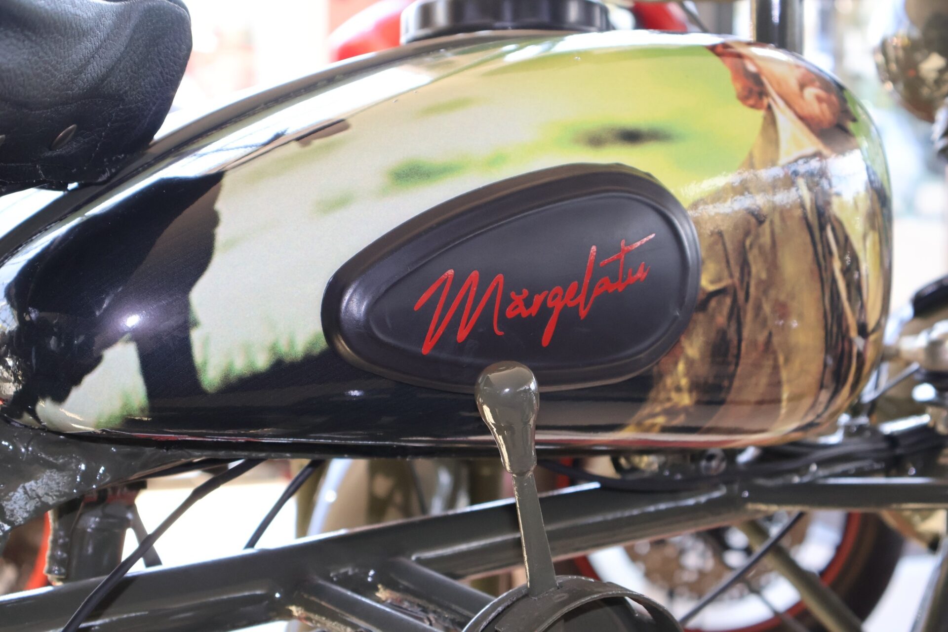 Motocicleta este o piesă unicat, cu un motor din anul 1936, anul nașterii lui Florin Piersic. Piesa de rezistență este rezervorul de benzină, pe care este pictat chipul actorului în rolul din filmul „Mărgelatu”, iar în partea din față este montat celebrul pistol cu șase țevi pe care Piersic l-a folosit în rolul emblematic din această serie de filme.