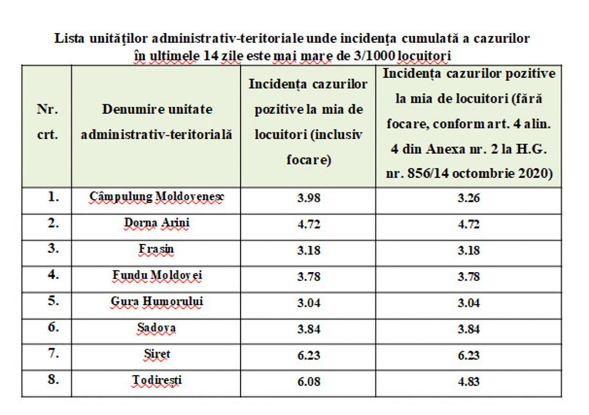 Astfel, în localitățile unde incidența cumulată a cazurilor în ultimele 14 zile este mai mare de 3/1.000 de locuitori sunt interzise: desfășurarea activității în cadrul cinematografelor, instituțiilor de spectacole și/sau concerte; activitatea cu publicul a operatorilor economici care desfășoară activități de preparare, comercializare și consum al produselor alimentare și/sau băuturilor alcoolice și nealcoolice, de tipul restaurantelor și cafenelelor, în interiorul clădirilor; activitatea cu publicul a operatorilor economici licențiați în domeniul jocurilor de noroc. Purtarea măștii de protecție, astfel încât să acopere nasul și gura, este obligatorie pentru toate persoanele care au împlinit vârsta de 5 ani, în toate spațiile publice deschise. Aceste localități sunt: Câmpulung Moldovenesc, Dorna Arini, Frasin, Fundu Moldovei, Gura Humorului, Sadova, Siret și Todirești.