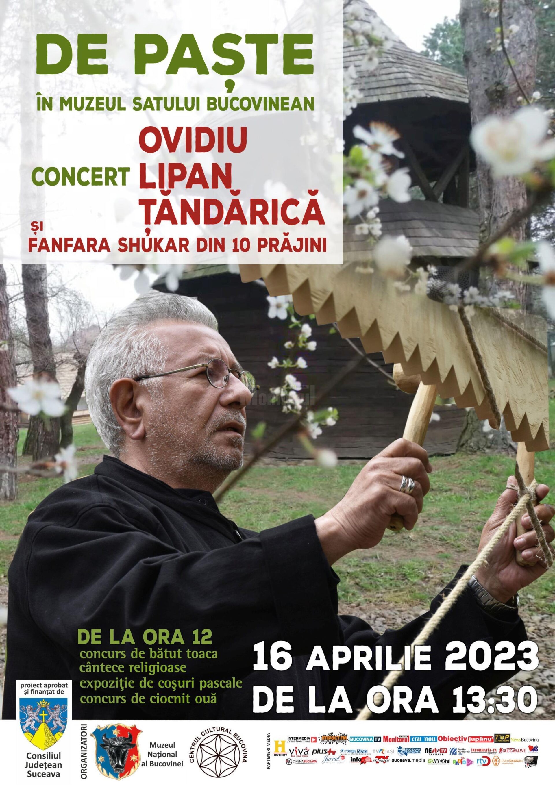 Ovidiu Lipan Țăndărică și Fanfara Shukar din 10 Prăjini vor concerta duminică, 16 aprilie 2023, începând cu ora 13:30, la Muzeul Satului Bucovinean. Tot duminică, în prima zi de Paște, de la ora 12:00, după ce se termină slujba Învierii Mici laBiserica „Înălțarea Domnului” (biserică din comuna Vama, edificiu liturgic translatat în Muzeul Satului Bucovinean),puteți să asistați la un concurs de bătut toaca, să ascultați cântece religioase, să admirați o expoziție de coșuri pascale și să participați la un concurs de ciocnit ouă. Evenimentul se desfășoară în cadrul Programului „Paștele în Bucovina”.