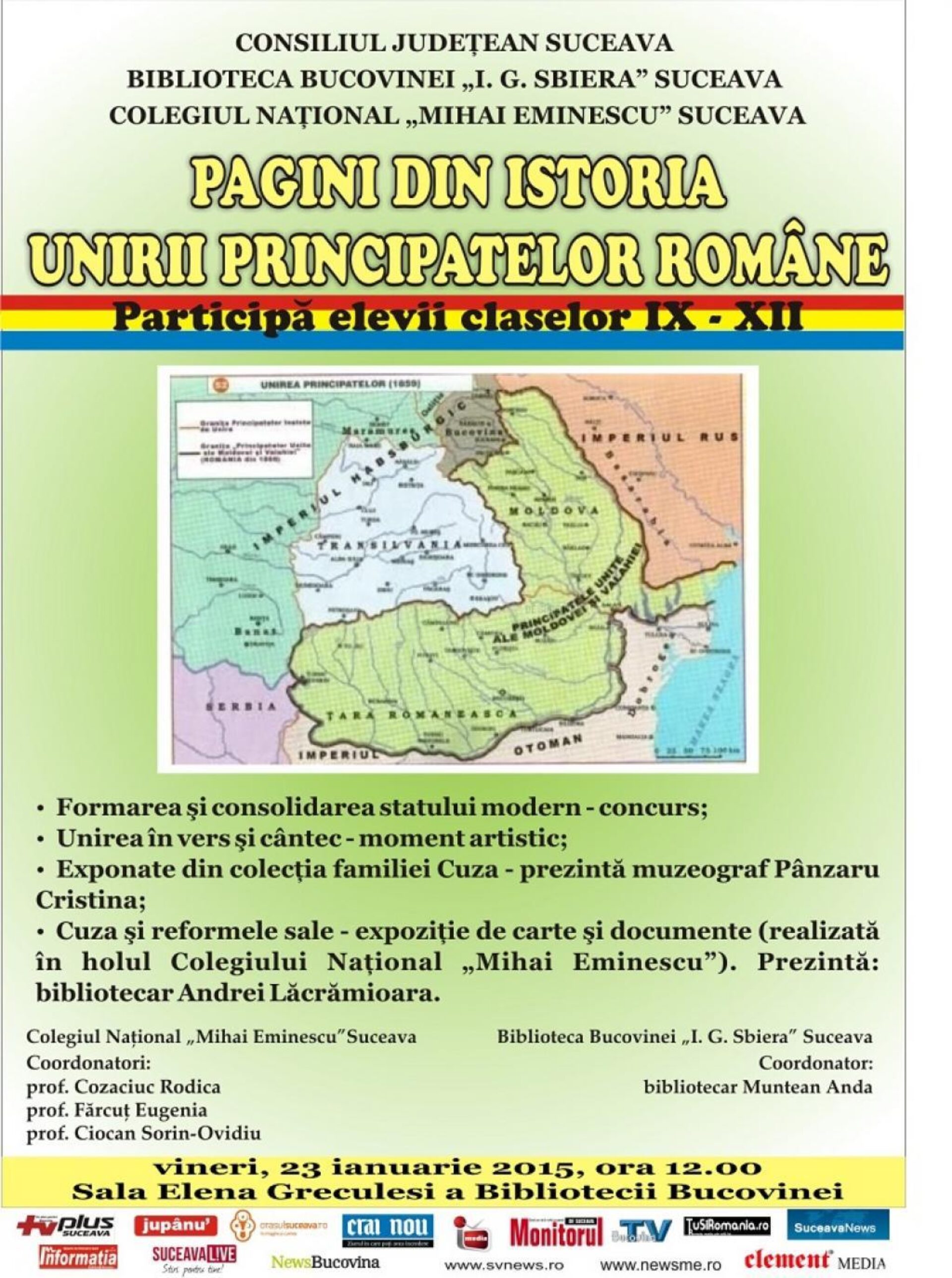 Consiliul Județean Suceava, Biblioteca Bucovinei „I.G. Sbiera” și Colegiul Național „Mihai Eminescu” Suceava organizează vineri, 23 ianuarie a.c., la ora 12.00, în Sala de Artă „Elena Greculesi” a bibliotecii publice județene, manifestarea cu genericul „Pagini din istoria Unirii Principatelor Române”. Participă elevii claselor IX – XII ai colegiului sucevean sub coordonarea prof. Cozaciuc Rodica, Fărcuț Eugenia, Sorin-Ovidiu Ciocan și a bibliotecarei Anda Muntean. Programul manifestării circumscrie concursul „Formarea și consolidarea statului modern”, momentul artistic „Unirea în vers și cântec”, prezentarea exponatelor din colecția familiei Cuza (prezintă muzeograf Cristina Pânzaru), precum și expoziția de carte și documente „Cuza și reformele sale” – realizată în holul Colegiului Național „Mihai Eminescu” Suceava (prezintă bibliotecar Andrei Lăcrămioara).