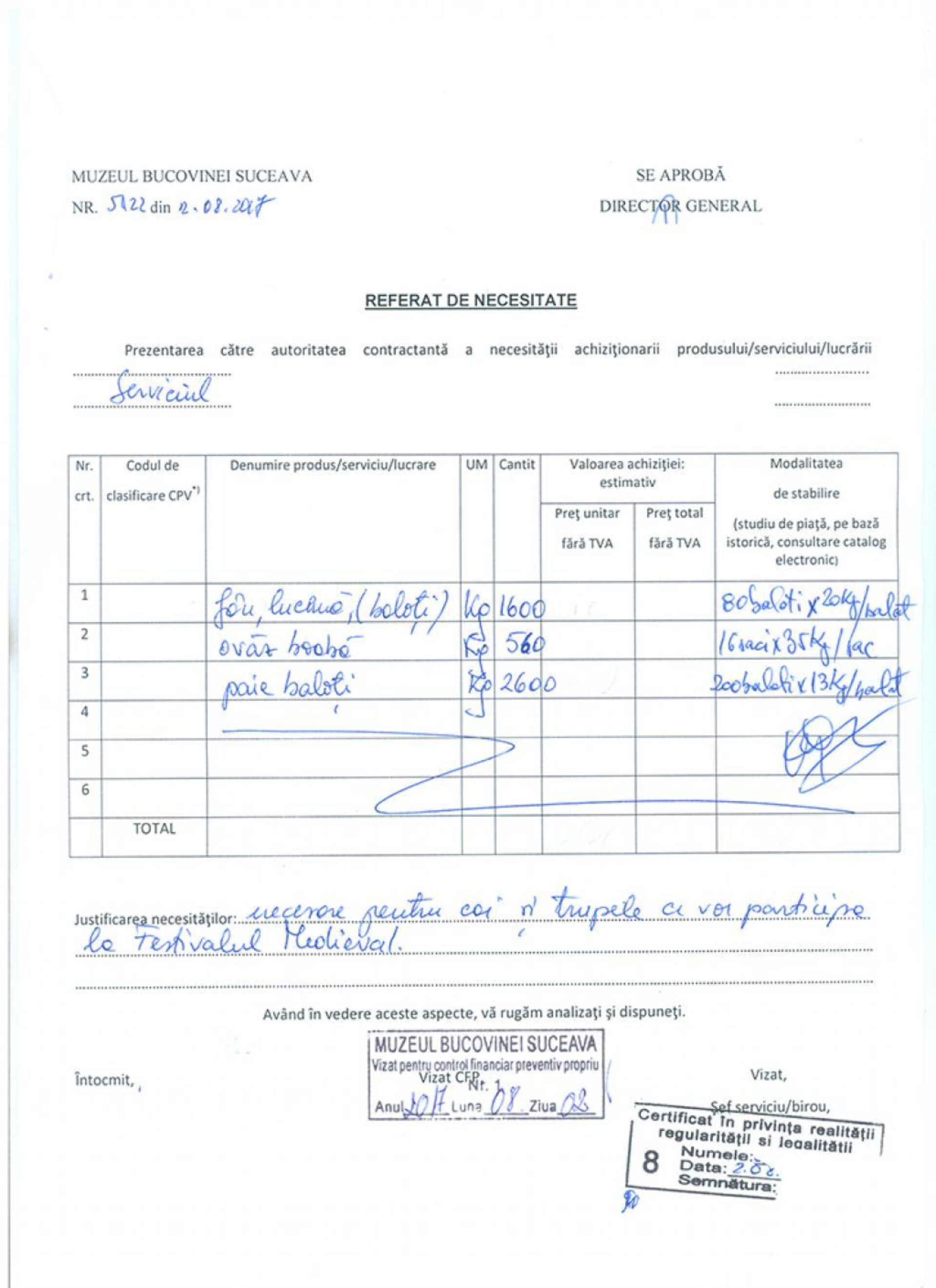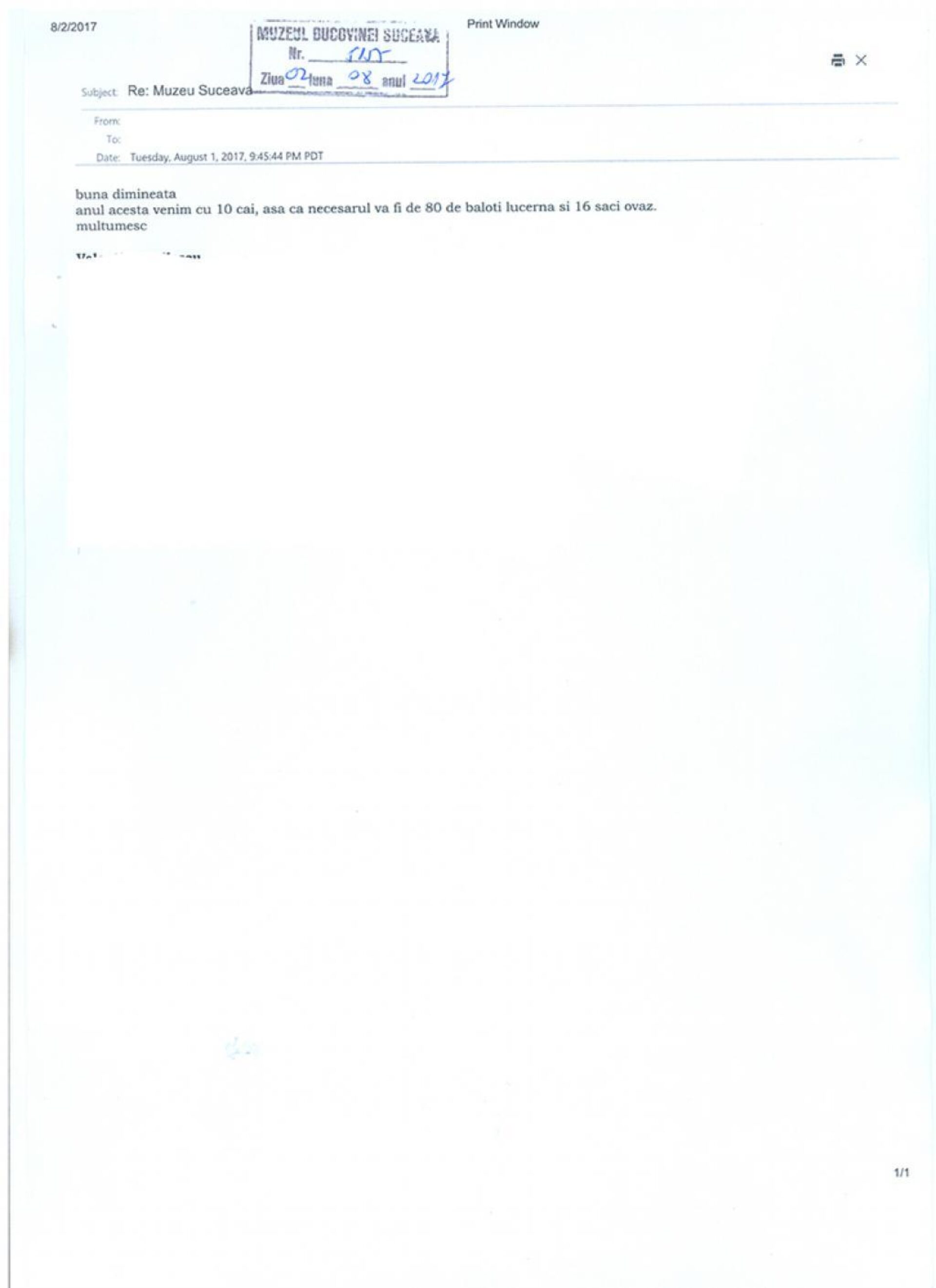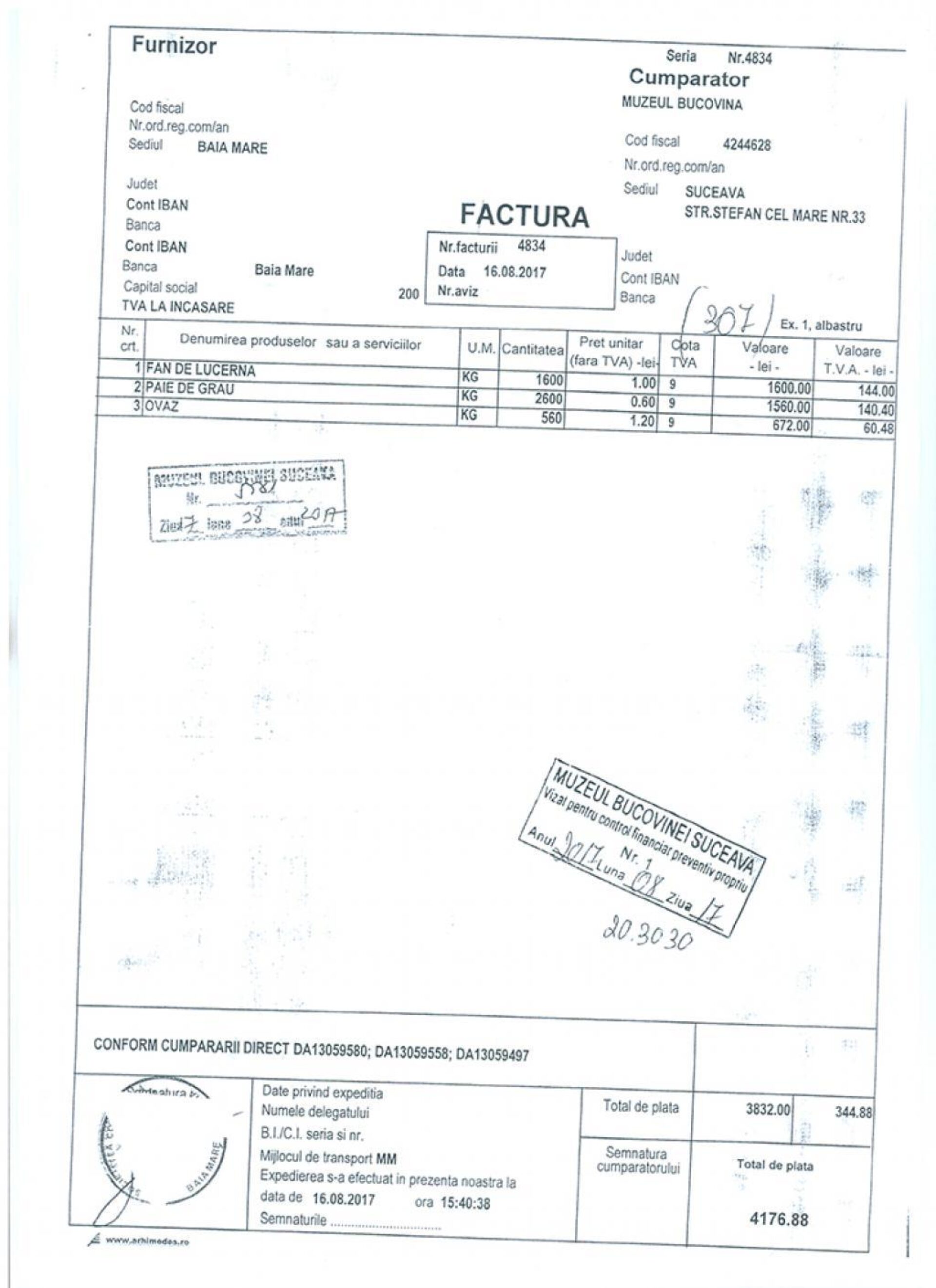 Pentru cele 2.600 kg de paie, 1.600 kg lucernă și 460 kg ovăz date de mâncare la cai, muzeul a întocmit un vraf de documente, inclusiv notă de fundamentare și caiet de sarcini pentru achiziția prin Sistemul Electronic de Achiziții Publice (SEAP), semnate de nu mai puțin de nouă funcționari. Directorul muzeului, Emil Ursu, ne-a declarat că din cauza faptului că pe SEAP majoritatea ofertelor erau de la firme din sudul țării, care asigurau transportul gratuit la maximum 40 km distanță, a făcut anunț de achiziție și a solicitat și alte oferte, care să includă transportul. Altfel, costa mai mult transportul decât nutrețul pentru animale. ”Am primit trei oferte, de la Iași, Suceava și Baia Mare și a rămas Baia Mare, cu 4.000 de lei pentru toată cantitatea de nutreț, cu transport inclus. La celelalte două prețul era în jur de 6.000 de lei”, ne-a spus directorul Ursu.