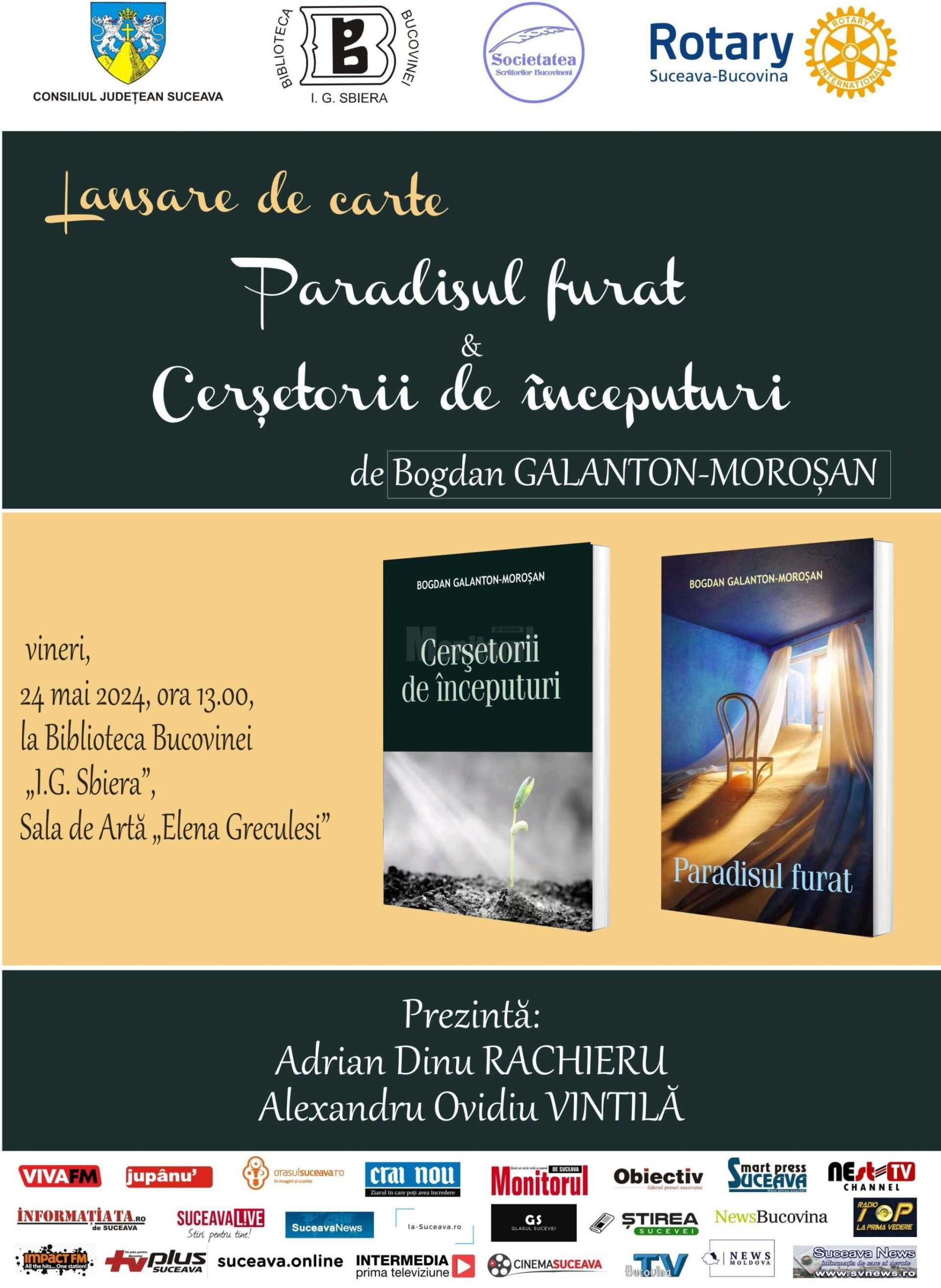 La Biblioteca Bucovinei „I. G. Sbiera”, Sala de Artă „Elena Greculesi”, va avea loc, vineri, 24 mai 2024, la ora 13:00, lansarea volumelor „Paradisul furat” și „Cerșetorii de începuturi”, semnate de Bogdan Galanton-Moroșan.