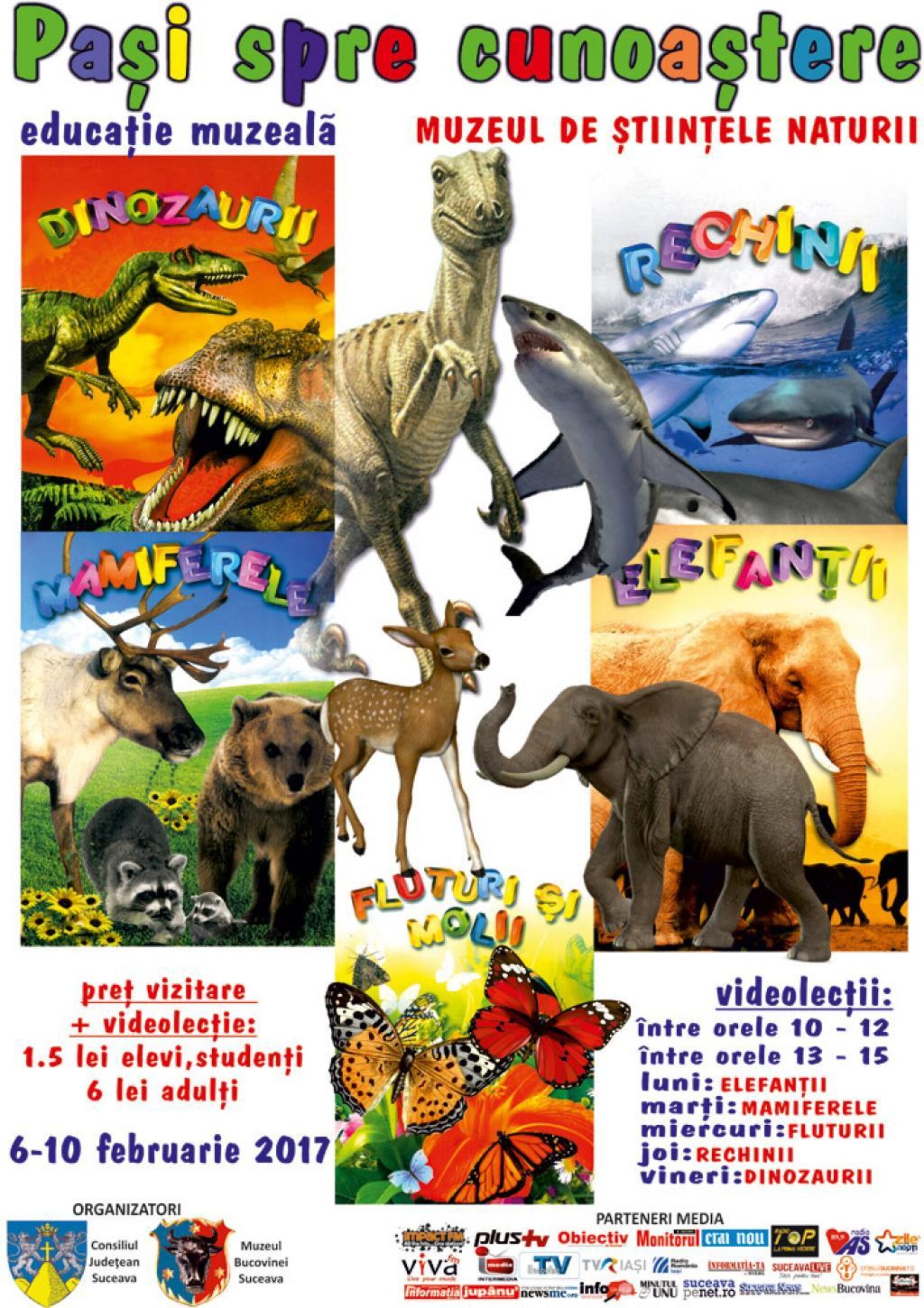 Muzeul Bucovinei Suceava organizează, în vacanța intersemestrială, perioada 6-10 februarie, la Muzeul de Științele Naturii, „lecții de muzeu” însoțite de proiecții video prin intermediul cărora elevii sunt invitați să cunoască lumea fascinantă a dinozaurilor, să cunoască speciile de rechini, să admire coloritul fluturilor, să se plimbe prin locuri exotice unde pot întâlnii și cunoaște elefanții și să facă cunoștință cu diverse specii de mamifere.