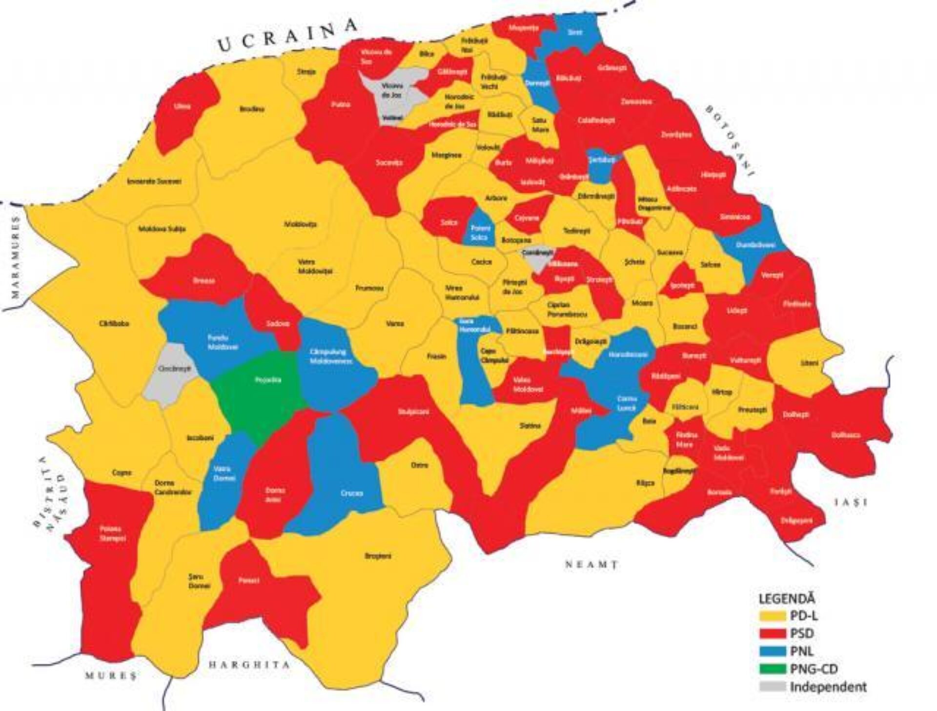 Dintre cele 52 de localități în care s-a desfășurat turul al doilea, PD-L s-a impus în 26 de localități, PSD în 15 și PNL în 8. PNG – CD a câștigat o primărie, la Pojorâta, iar în două localități, Vicov de Jos și Comănești s-au impus candidați independenți.
