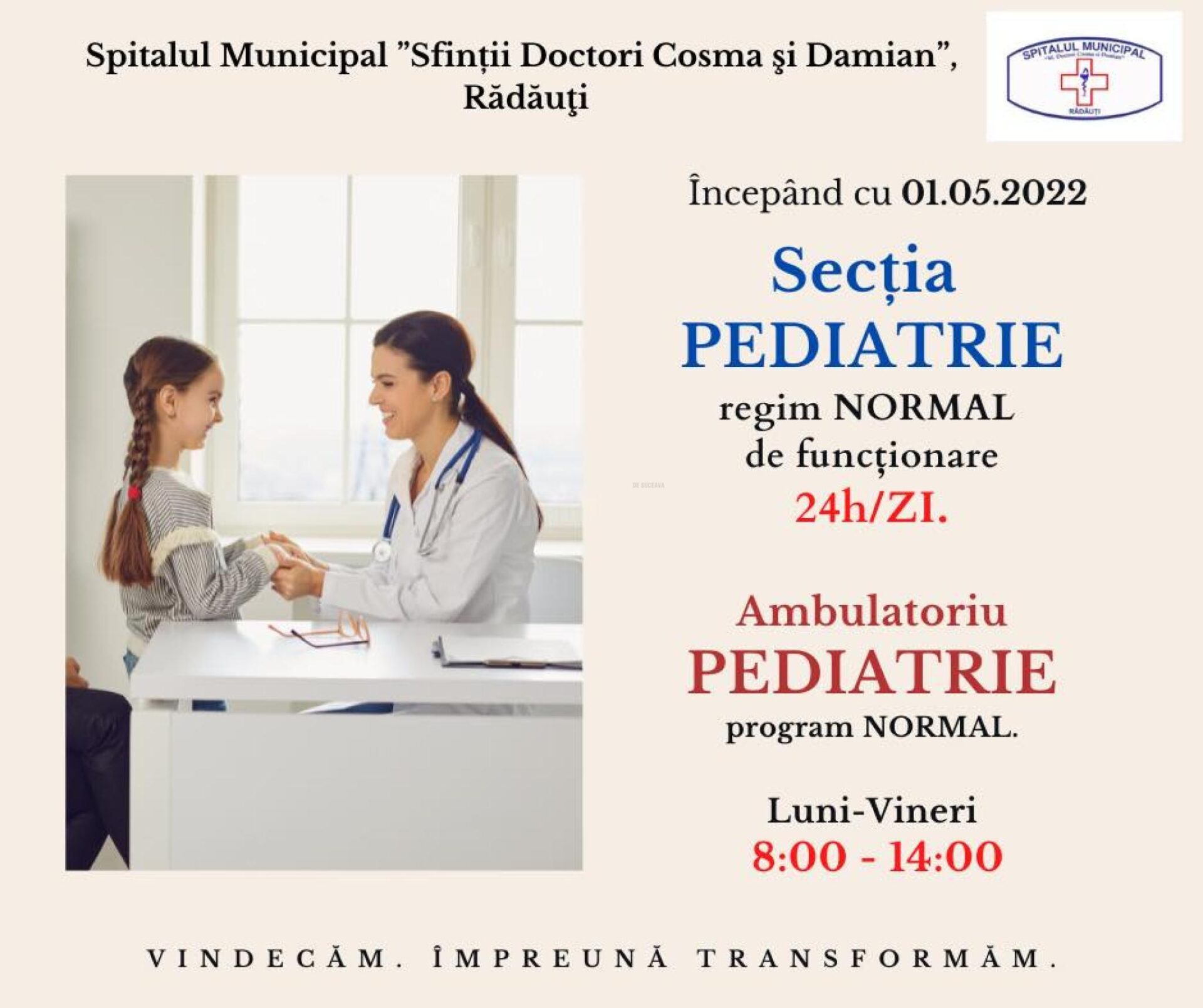 Secția Pediatrie a Spitalului Municipal „Sfinții Doctori Cosma și Damian” Rădăuți și-a reluat activitatea, din data de 1 mai a.c.. Conducerea unității medicale a anunțat că s-a redeschis linia de gardă a secției, s-au reluat spitalizările, internările de zi și activitatea în ambulatoriul de specialitate. Programul ambulatoriului este de luni pînă vineri, între orele 08.00 – 14.00. Secția Pediatrie de la Rădăuți s-a închis în data de 22 martie a.c., pe perioadă nedeterminată, din cauza lipsei de personal. La acest moment, potrivit managerului Dan Vatră, secția, cu 30 de paturi, are trei medici pediatri și trei care fac gărzi.