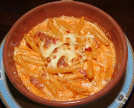 Se trage la tigaie baconul împreună cu pieptul de pui și restul legumelor și se stinge cu puțin vin. Apoi se adaugă sosul de roșii împreună cu smântâna și parmezanul. Se adaugă pastele care se trag la tigaie în sosul rezultat și se introduc într-un vas de lut și se dau la cuptor timp de 5-6 minute.