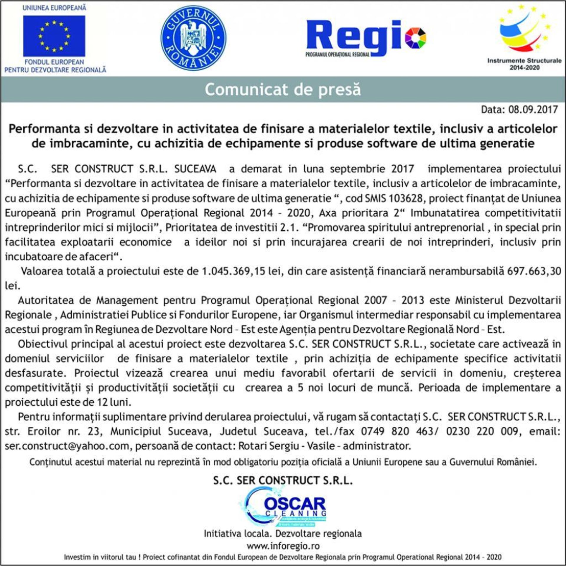 S.C. SER CONSTRUCT S.R.L. SUCEAVA a demarat in luna septembrie 2017 implementarea proiectului “Performanta si dezvoltare in activitatea de finisare a materialelor textile, inclusiv a articolelor de imbracaminte, cu achizitia de echipamente si produse software de ultima generatie “, cod SMIS 103628, proiect finanțat de Uniunea Europeană prin Programul Operațional Regional 2014 – 2020 , Axa prioritara 2 “ Imbunatatirea competitivitatii intreprinderilor mici si mijlocii”, Prioritatea de investitii 2.1. “Promovarea spiritului antreprenorial , in special prin facilitatea exploatarii economice a ideilor noi si prin incurajarea crearii de noi intreprinderi, inclusiv prin incubatoare de afaceri “.