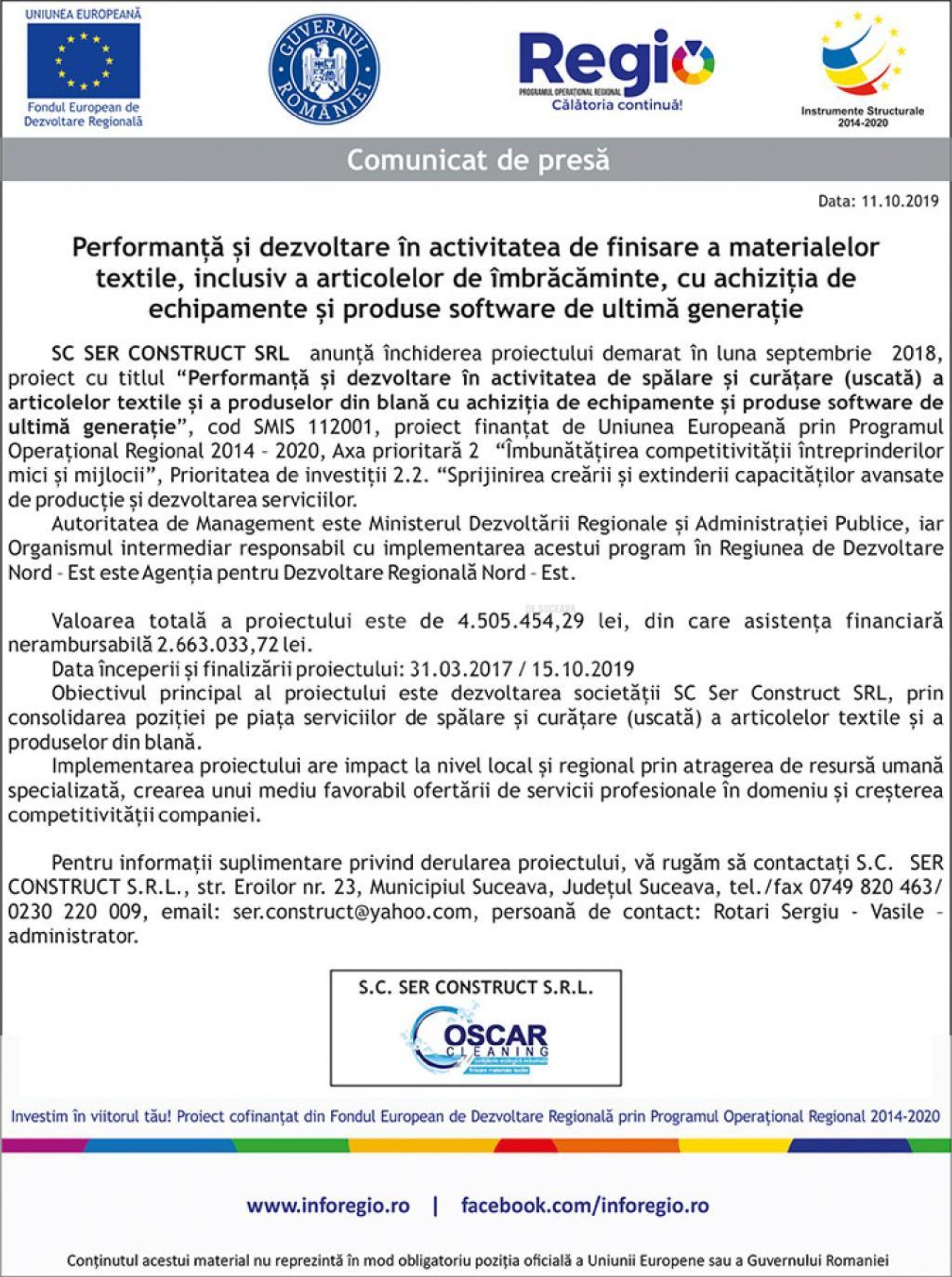 SC Ser Construct SRL anunță închiderea proiectuluidemarat în luna septembrie 2018, proiect cu titlul “ Performanță și dezvoltare în activitatea de spălare și curățare (uscată) a articolelor textile și a produselor din blană cu achiziția de echipamente și produse software de ultimă generație“, cod SMIS 112001, proiect finanțat de Uniunea Europeană prin Programul Operațional Regional 2014 – 2020, Axa prioritară 2 “Îmbunătățirea competitivității întreprinderilor mici și mijlocii”, Prioritatea de investiții 2.2. “Sprijinirea creării și extinderii capacităților avansate de producție și dezvoltarea serviciilor.