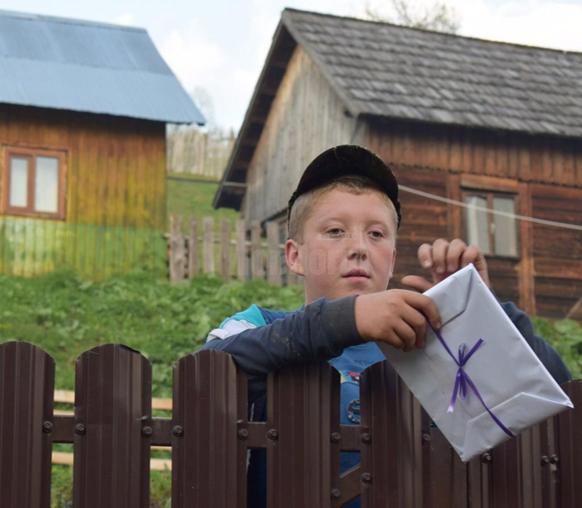 Și atunci, „mesagerul” a fost prof. Daniela Ceredeev, directoarea Liceului Tehnologic „Vasile Cocea” Moldovița, care a mers la locuința fiecărui copil pentru a-i înmâna darul prețios.
