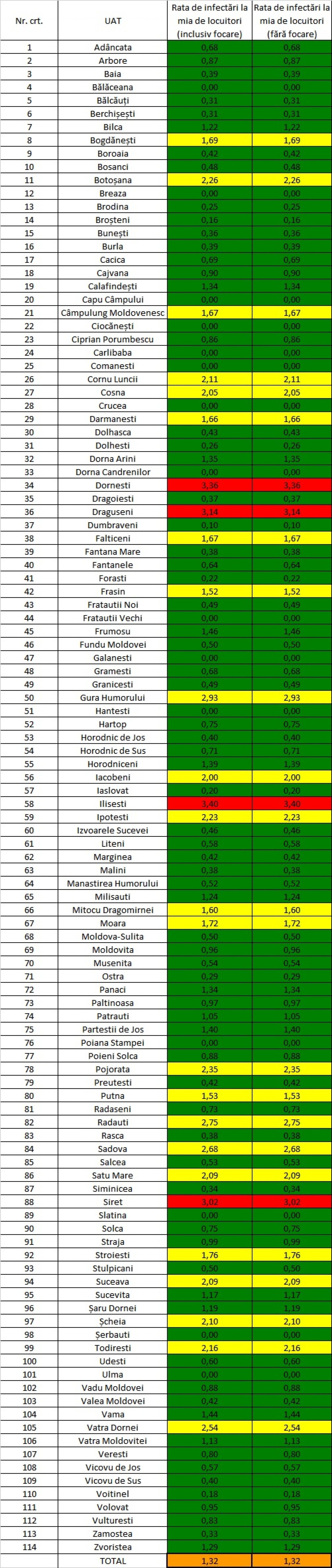 Cazurile de Covid-19 în evoluție în județul Suceava au ajuns, marți, la 1.029, iar numărul localităților fără nici un caz a scăzut de la 17 la 15. Alte 20 de localități au câte un caz în evoluție, 32 au sub cinci cazuri, 30 au sub zece cazuri, iar 17 au peste zece cazuri în evoluție. În municipiul Suceava incidența cazurilor pozitive este de 2,09 la mie.