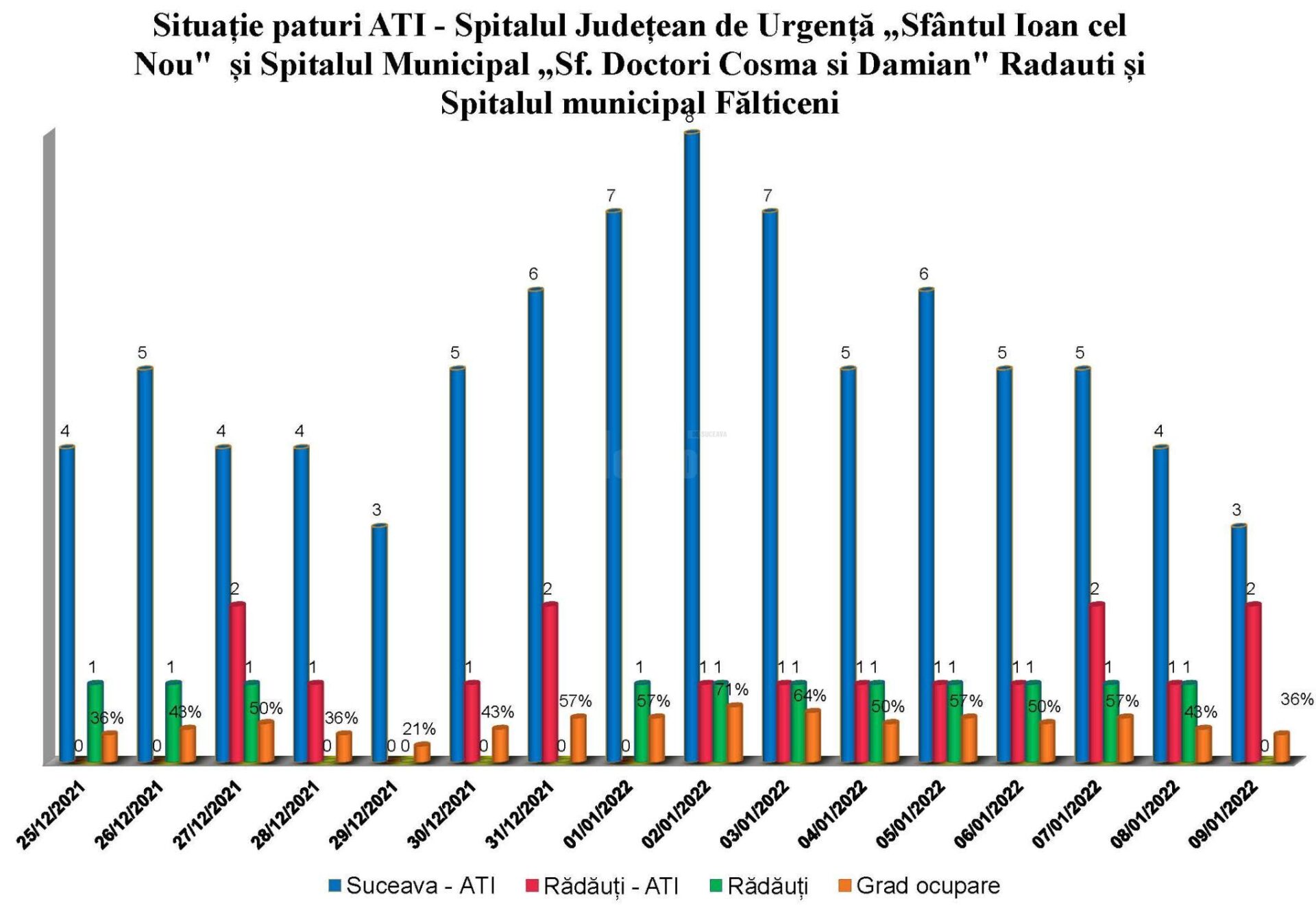 În acest val, în spitalele din județul Suceava au fost internate, în intervalul 8-9 ianuarie, 17 persoane cu Covid și au fost externate 8 persoane. În aceeași perioadă de referință a decedat o persoană ca urmare a infecției Covid – 19. Duminică dimineață, în spitalele din județ erau internați 139 de pacienți confirmați cu Covid și 31 de pacienți suspecți de infectare.