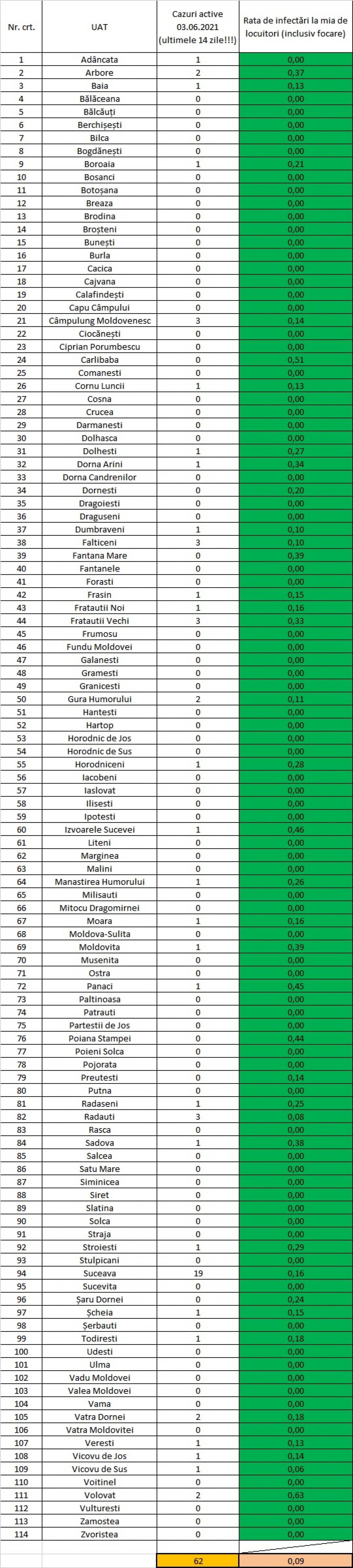 Din cele 114 localități din județ, 82 nu au niciun caz de infecție Covid-19 în evoluție, 23 au câte un caz, 8 au sub cinci cazuri, iar una are peste zece cazuri în evoluție. În municipiul Suceava sunt 19 cazuri în evoluție și o incidență de 0,16 la mie. În total, în județ sunt la această dată 62 cazuri de infecție Covid-19 în evoluție.