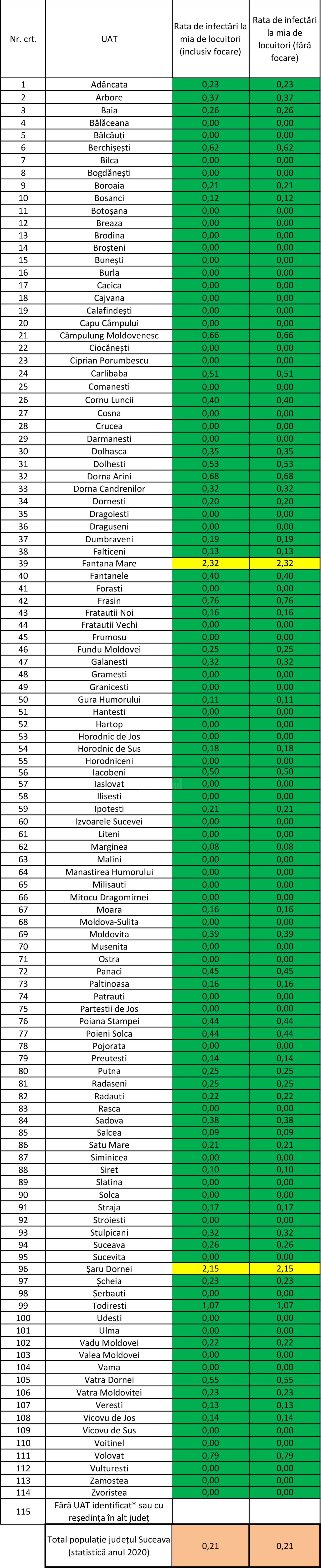 Din cele 114 localități din județ, 63 nu au niciun caz de infecție Covid-19 în evoluție, 28 au câte un caz, 14 au sub cinci cazuri, 7 au sub zece cazuri, iar două au peste zece cazuri în evoluție. În total, luni dimineață erau 158 de cazuri de infecție Covid -19 în evoluție. Cele două cazuri noi de îmbolnăvire înregistrate la începutul acestei săptămâni sunt din Rădăuți și Arbore. În municipiul Suceava sunt 31 de cazuri în evoluție și o incidență de 0,26 la mie.