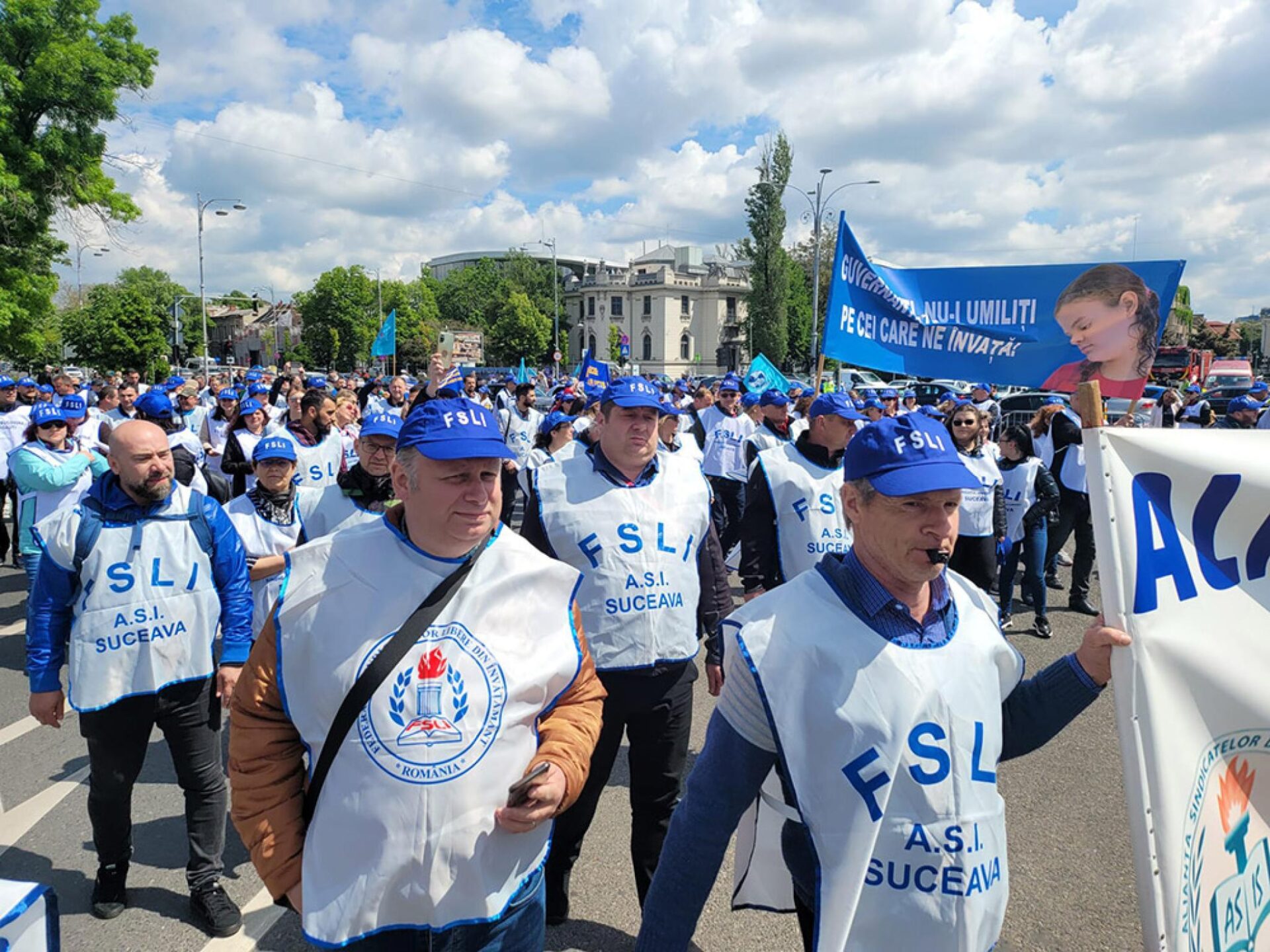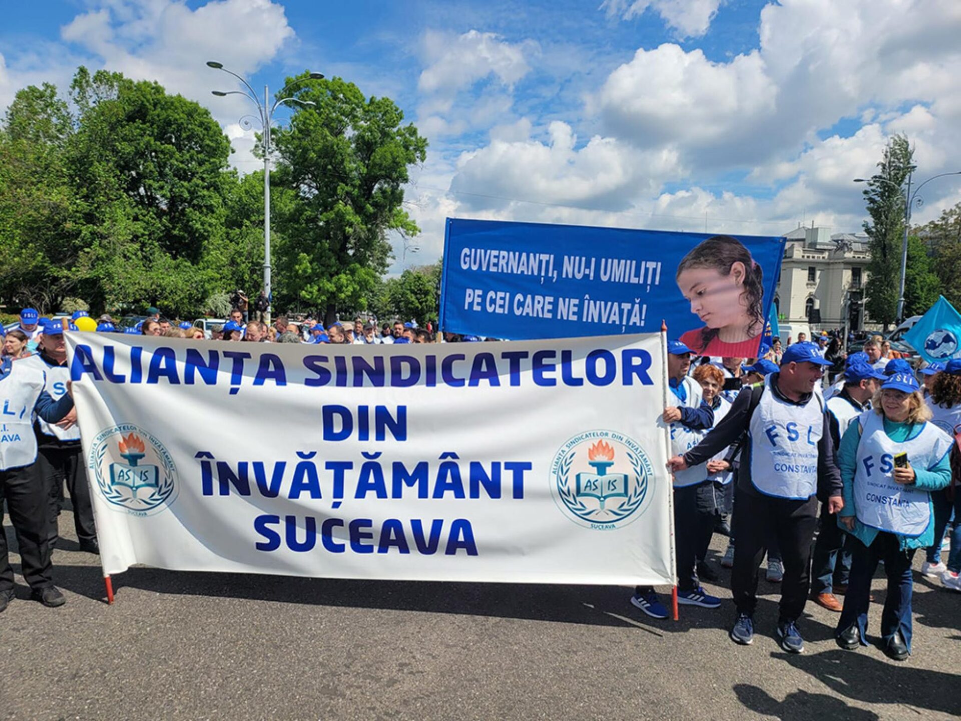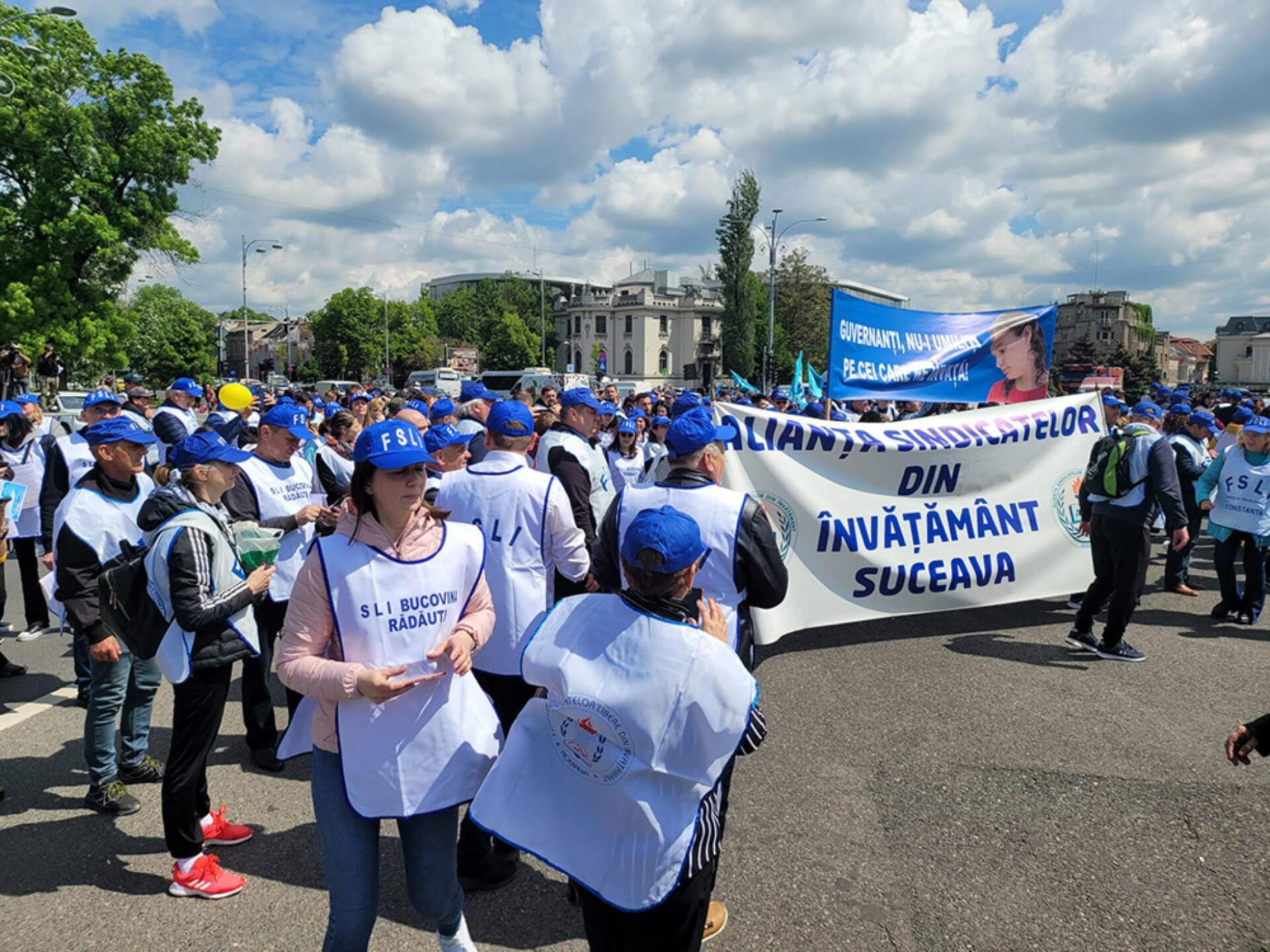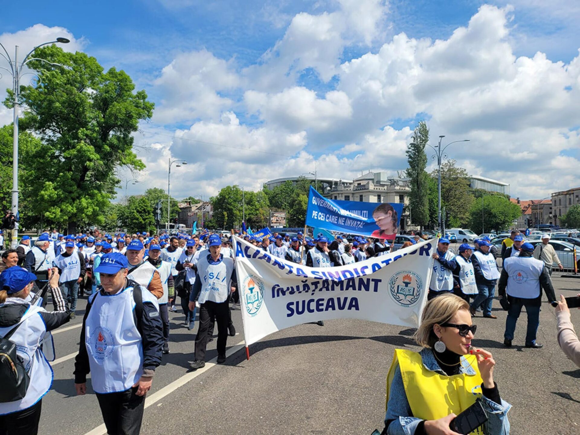 Peste 250 de oameni ai școlii din județul Suceava au protestat miercuri, 10 mai, la București, alături de alte câteva mii de angajați din învățământul preuniversitar din toată țara.
