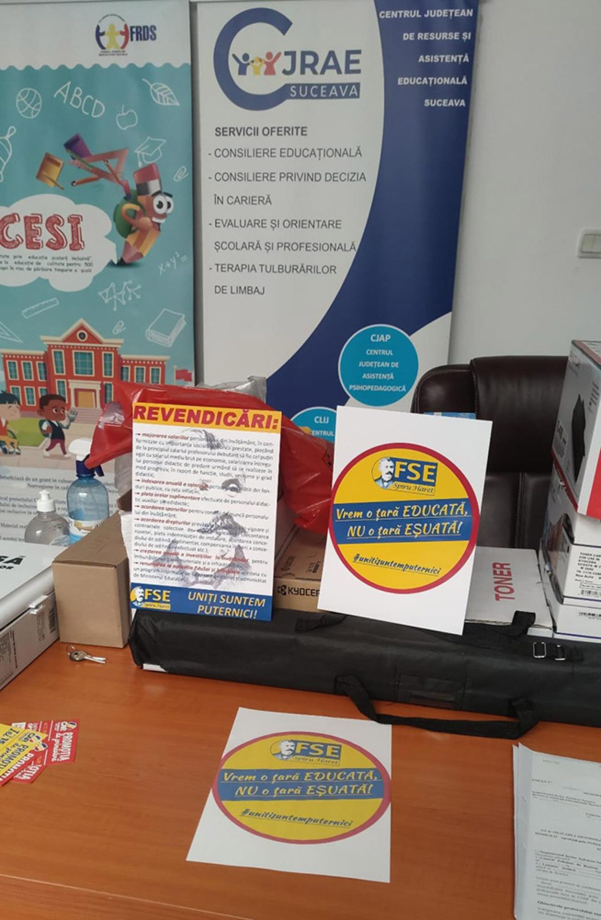 Membri ai „Pro Educația” din câteva școli sucevene au purtat la piept ecusoane cu mesajul ”Vrem o țară EDUCATĂ, NU o țară EȘUATĂ! #unițisuntemputernici” și au lipit afișe cu revendicările lor.