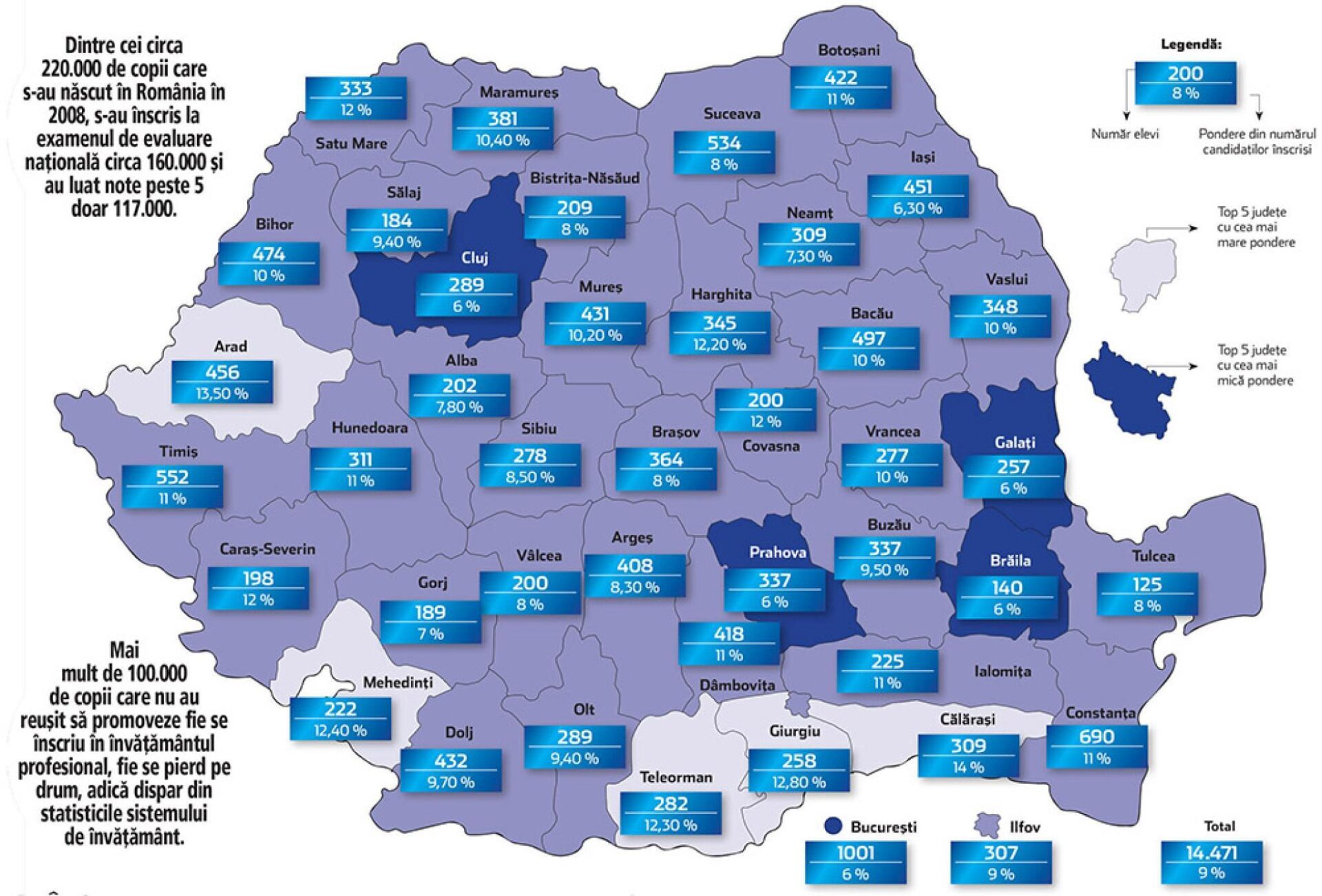 Potrivit zf.ro, în Călărași, ponderea elevilor cu medii mai mari de 8 în clasele V-VIII care s-au înscris la evaluarea națională și nu au promovat examenul este de 14%, în Arad ponderea este de 13,5%, iar în Giurgiu este de 13%.