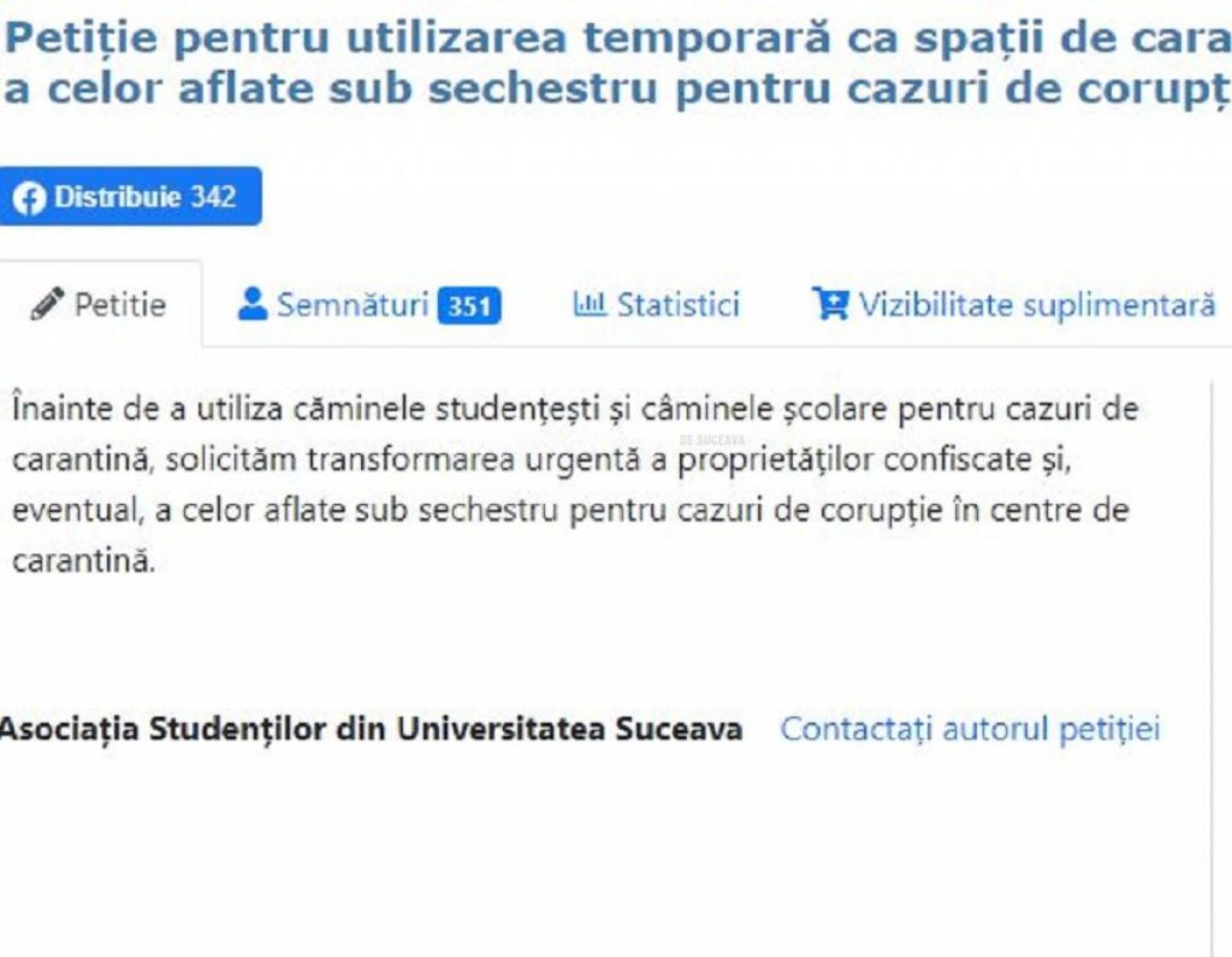 Asociația Studenților din Universitatea Suceava (ASUS) anunță că a pornit o petiție on-line prin care solicită utilizarea temporară a proprietăților confiscate și a celor aflate în sechestru în centre de carantină, înainte de a utiliza căminele studențești și căminele școlare pentru cazuri de carantină.
