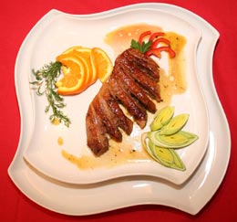 Pieptul de rață se crestează și se așează pe grătarul încins. După ce a fost prăjit bine pe ambele părți, se așează într-o tigaie unde în prealabil untul a fost topit. Se storc lămâile și portocalele peste carne și se lasă să fiarbă timp de 10 minute după care se toarnă coniacul și se flambează timp de 1 minut. Se adaugă sare și piper după gust.