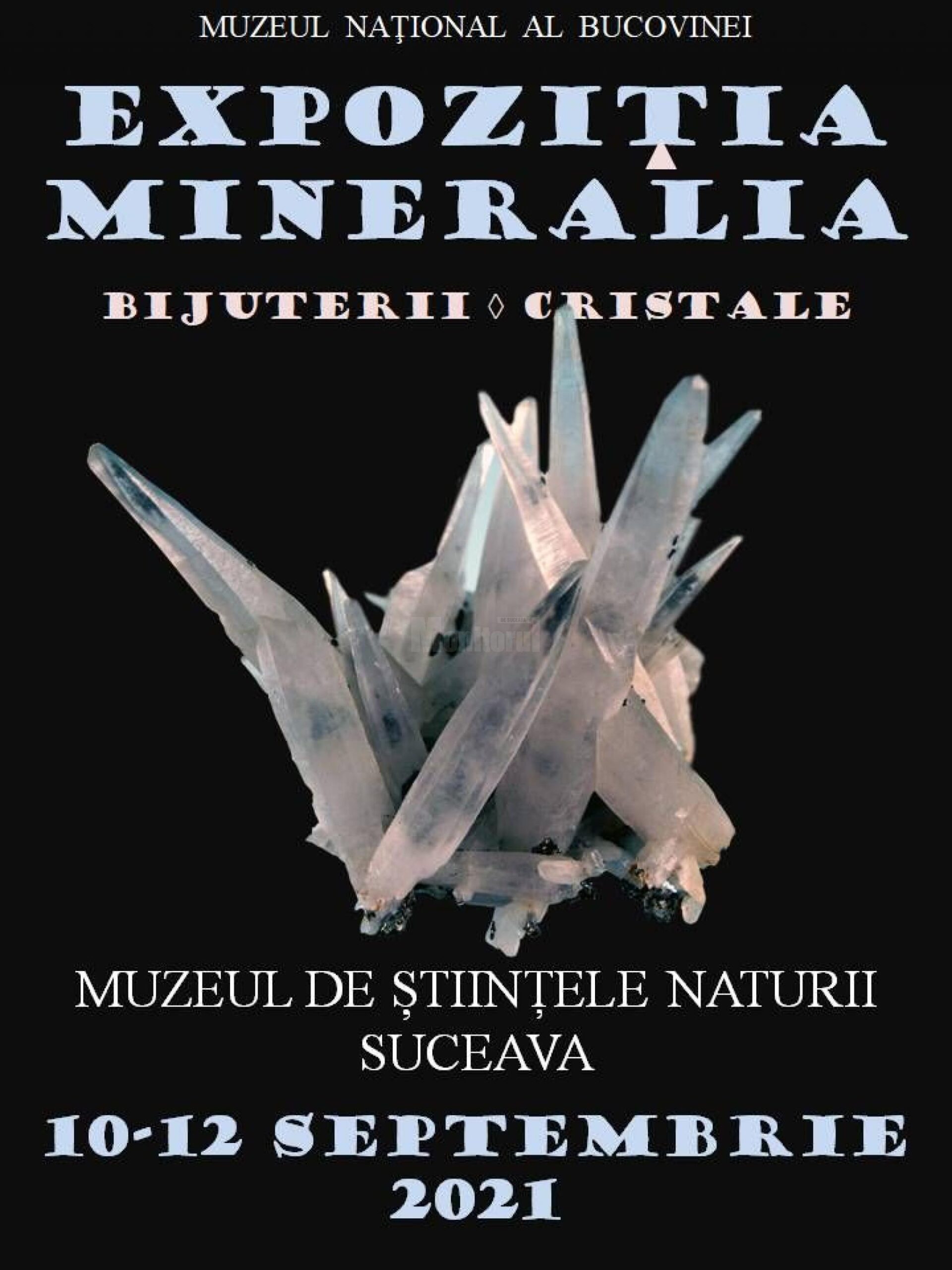 Muzeul Național al Bucovinei vă invită, în perioada 10-12 septembrie 2021, să vizitați expoziția „Mineralia”, ce va fi deschisă la Muzeul de Științele Naturii. Expoziția prezintă pietre brute, pietre montate ca bijuterii, pietre cristalizate, pietre șlefuite, pietre zodiacale, pietre de colecție, pietre semiprețioase. Bijuterii dintre cele mai diverse (brățări, medalioane, coliere, cercei sau inele), având ca numitor comun piatra naturală, șlefuită rotund sau fațetată, sunt realizate din turmalină, jad, granat, chihlimbar, perle, tanzanit, coral, turcoaz și ametist violet, citrin galben, cuarț roz, ochi de tigru, hematit multicolor, aventurin verde sau jasp roșu.