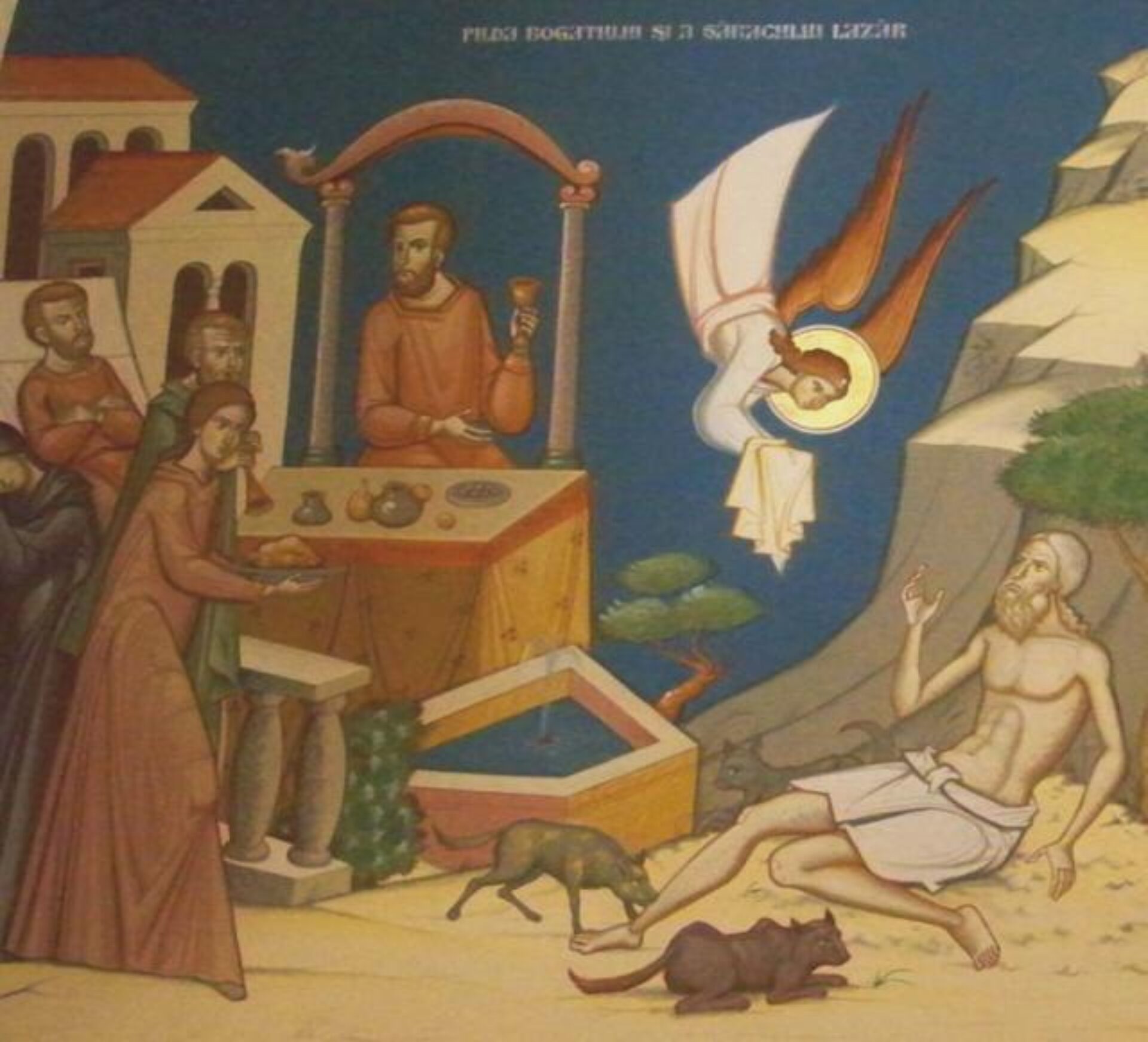În contrast cu el, se spune că la poarta lui zăcea de ani în șir un sărac pe nume Lazăr, bolnav și plin de bube, flămând, care dorea să guste măcar din resturile care cădeau de la masa bogatului, dar nici pe acestea nu le-a primit. Era singur, abandonat, având doar compania câinilor vagabonzi care îi lingeau rănile bubelor.