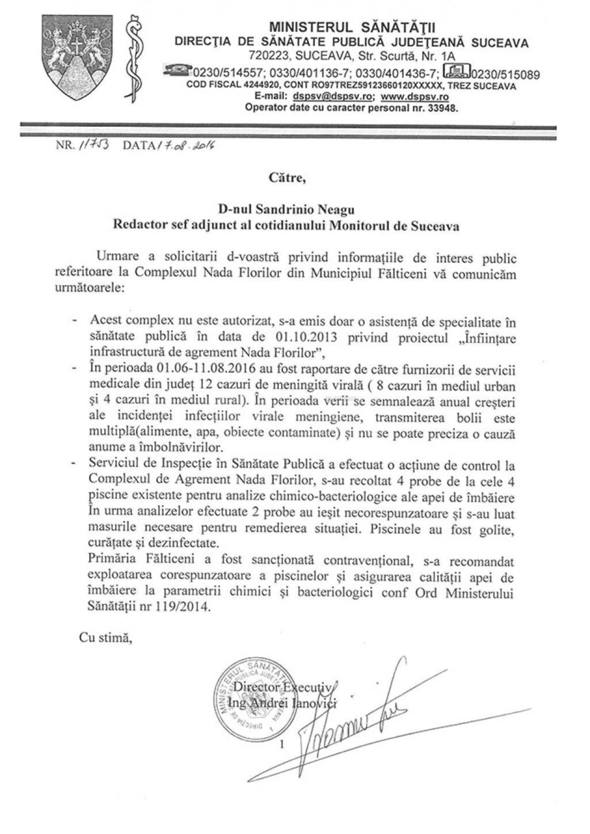 În plus, reprezentanții acestei instituții susțin că „Primăria Fălticeni a fost sancționată contravențional, s-a recomandat exploatarea corespunzătoare a piscinelor și asigurarea calității apei de îmbăiere la parametrii chimici și bacteriologici conform Ordinului Ministerului Sănătății nr. 119/2014”.