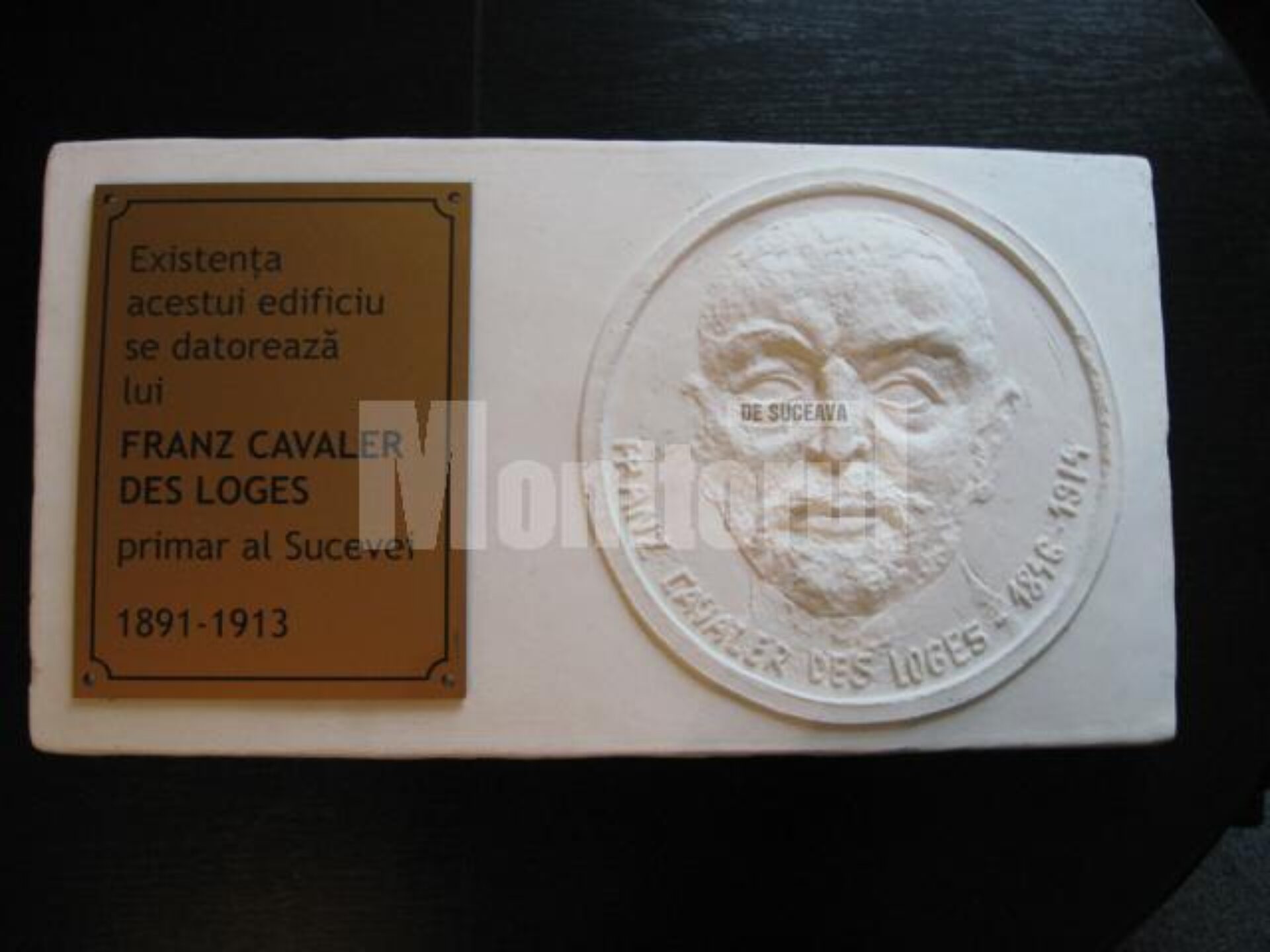 Executată din ciment marmorat alb, cu portretul în medalion al primarului care a administrat urbea înainte de izbucnirea primului război mondial, placa, pe care se află inscripția „Existența acestui edificiu se datorează lui Franz cavaler Des Loges, primar al Sucevei 1891-1913”, este menită să mențină vie memoria edilului în timpul căruia orașul a căpătat demnitatea unei adevărate capitale de district din Ducatul Bucovina.