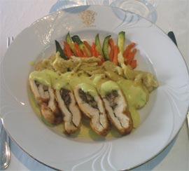 Separat se prepara sosul alb cu cognac si curry. Se bate pieptul de pui si umple cu ciupercile rumenite cu usturoiul si condimente. Se da prin faina, ou si se prajeste. Se feliaza pieptul de pui, se aseaza pe sos.