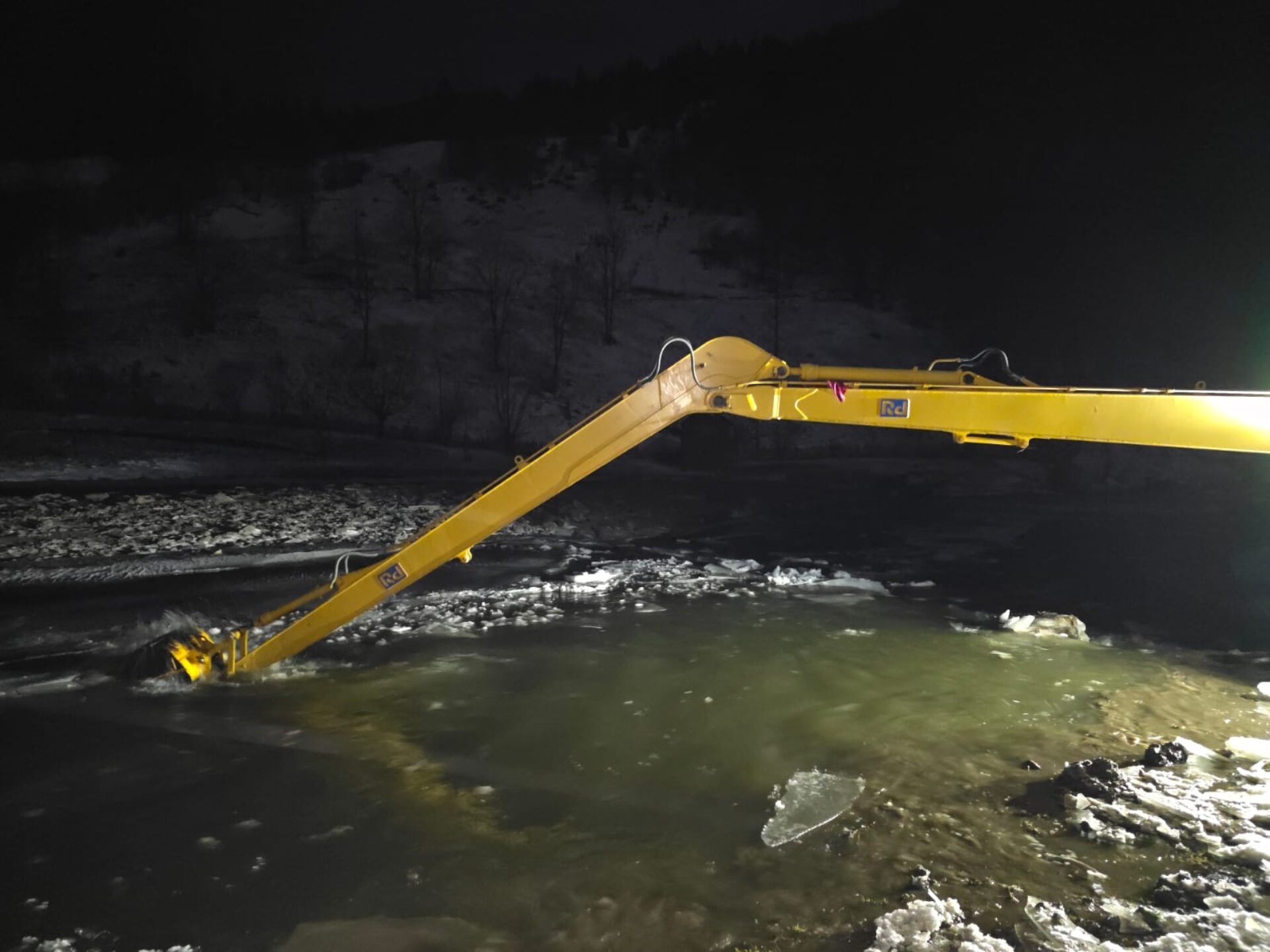 Echipele Sistemul de Gospodărire a Apelor Suceava sunt prezente în zonă, iar pentru sprijinirea activităților a fost dislocat un utilaj de tip excavator Komatsu PC 210, utilizat pentru degajarea controlată a acumulărilor de gheață, facilitarea curgerii apei și menținerea secțiunii de scurgere a albiei.