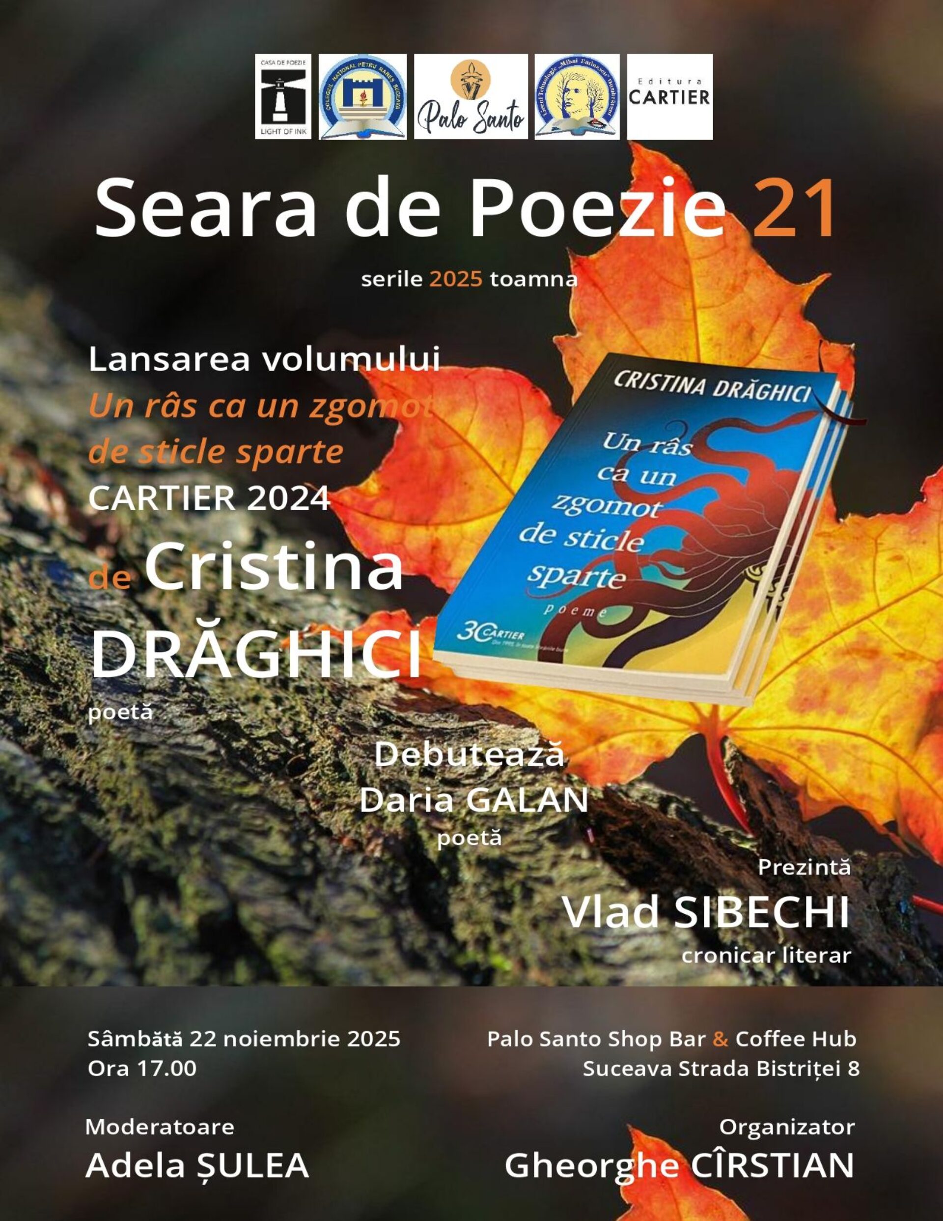 Poeta Cristina Drăghici va fi prezentă sâmbătă, 22 noiembrie 2025, începând cu ora 17.00, la Seara de Poezie 21 (serile 2025 toamna), organizată în Palo Santo Shop, Bar & Coffee Hub (municipiul Suceava, Strada Bistriței 8, cartier Obcini).