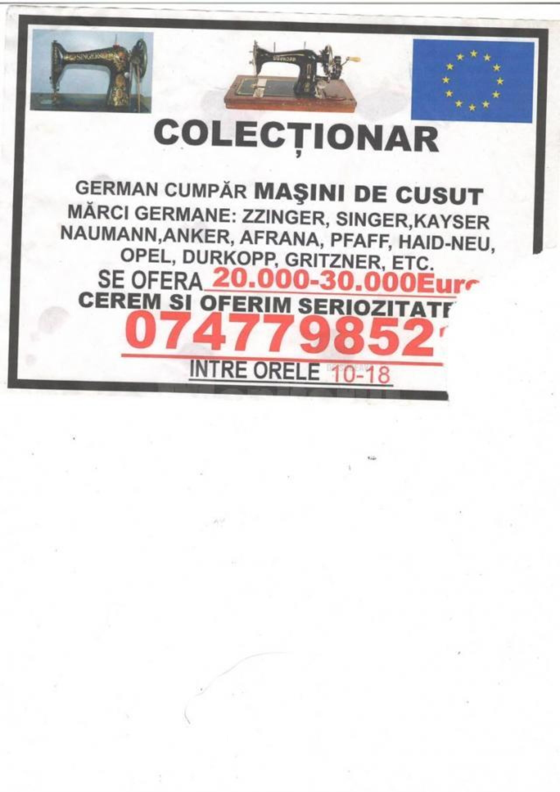În ultimele zile, în mai multe locații de pe raza municipiului Suceava care asigură vizibilitate (stâlpi de înaltă tensiune, stații de transport în comun, pereți ai clădirilor) au fost afișate anunțuri prin care se oferă sume mari de bani pentru achiziționarea unor mașini de cusut, diferite mărci. Poliția Suceava a ținut să facă următoarele precizări în legătură cu aceste anunțuri: „Atragem atenția cetățenilor să manifeste responsabilitate și să nu depună în diverse conturi sume de bani pentru efectuarea unor plăți. De asemenea, le recomandăm să nu dea curs unor astfel de solicitări, putând cădea victime ale unor infracțiuni de înșelăciune”.Polițiștii dau ca exemplu cazul unei persoane din municipiul Suceava, care în luna noiembrie 2013 a achitat unei persoane în autogara din Tg. Neamț suma de 5.000 euro pentru o mașină de cusut Singer și un certificat de calitate. Părții vătămate i s-a promis că va primi ulterior pe mașina de cusut cu certificat de garanție 40.000 euro, lucru care, evident, nu s-a mai întâmplat.