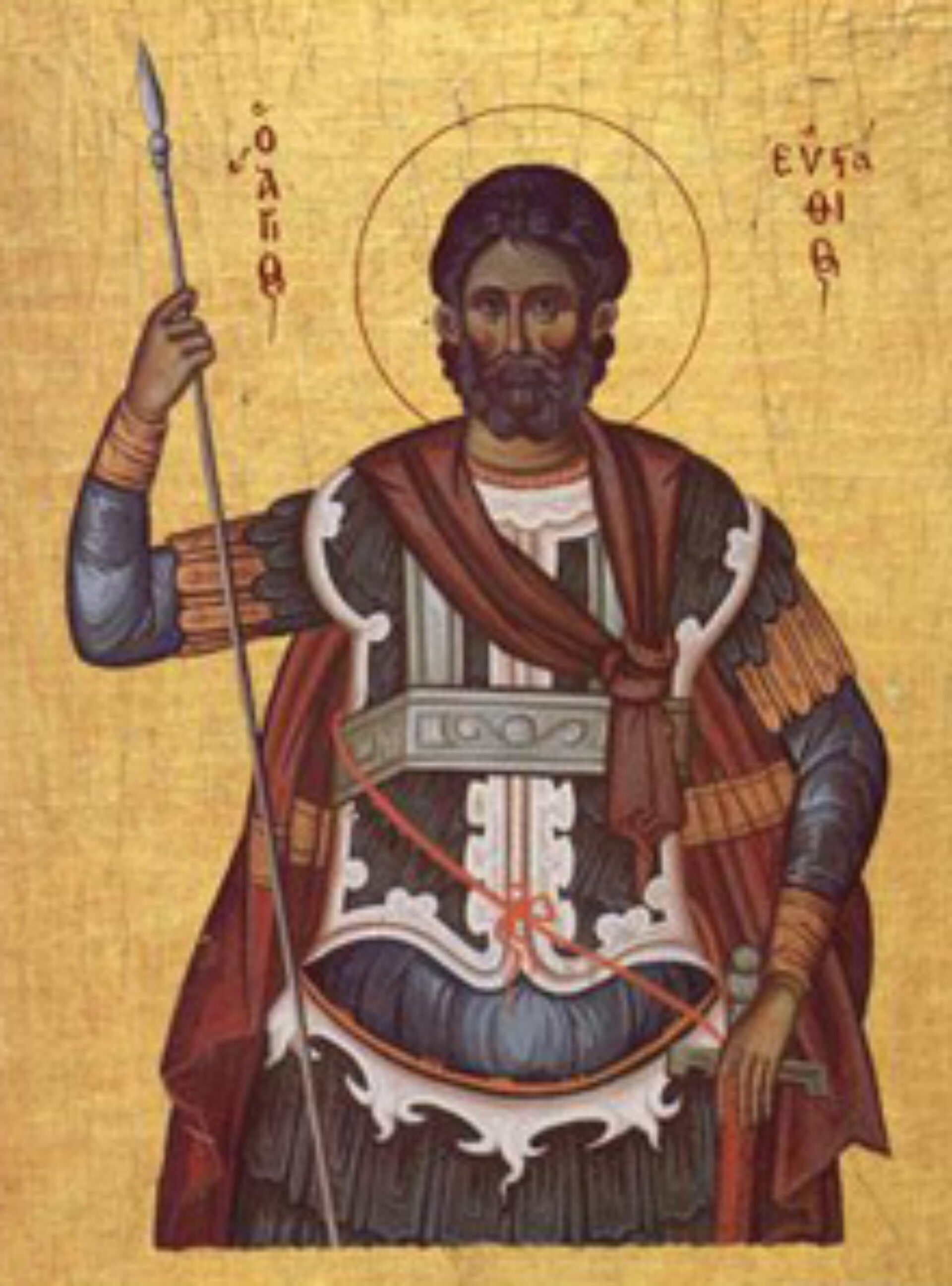 Acest sfânt mare Mucenic Eustatie (pe când se numea încă Placid, iar femeia lui – Tatiana) a fost general peste oști la Roma, pe vremea împăratului Traian (către anul 100). Și deși era un păgân bogat, el strălucea cu virtuțile, și mai ales era foarte milostiv față de săraci. Văzând deci Dumnezeu buna înclinare a sufletului lui, i s-a descoperit într-un chip asemănător celui în care s-a arătat Sfântului Apostol Pavel. Căci fiind într-o zi la vânat, i s-a arătat un cerb și a început a-l goni; și apropiindu-se a văzut între coarnele lui cinstita Cruce a lui Hristos, strălucind mai mult decât soarele, și pe dânsa chipul lui Hristos, și a auzit glas de la Cruce, zicând: „O, Placide! pentru ce mă prigonești? Eu sunt Hristos, pe Care tu-l cinstești fără să știi prin lucrările tale cele bune.” Uimit și speriat, Placid a căzut de pe cal și a rămas fără cunoștință mai multe ceasuri. Mântuitorul i-a apărut și a doua oară, ca să fie încredințat de adevărul din prima vedenie și ca să-i spună că El este Dumnezeu, Creatorul cerului și al pământului, și că din iubire pentru om a luat firea omenească și s-a întrupat pentru noi. Atunci Placide a crezut cu toată inima sa și s-a botezat, el și toată casa lui. Iar din botez el s-a numit Eustatie, soția lui, Teopista, iar cei doi copii ai lor: Agapie și Teopist. Văzând crescând credința și virtuțile sale, Domnul i-a apărut din nou și i-a spus că o să ajungă ca Iov, să îndure mari încercări din partea diavolului, dar că Harul va fi cu el.