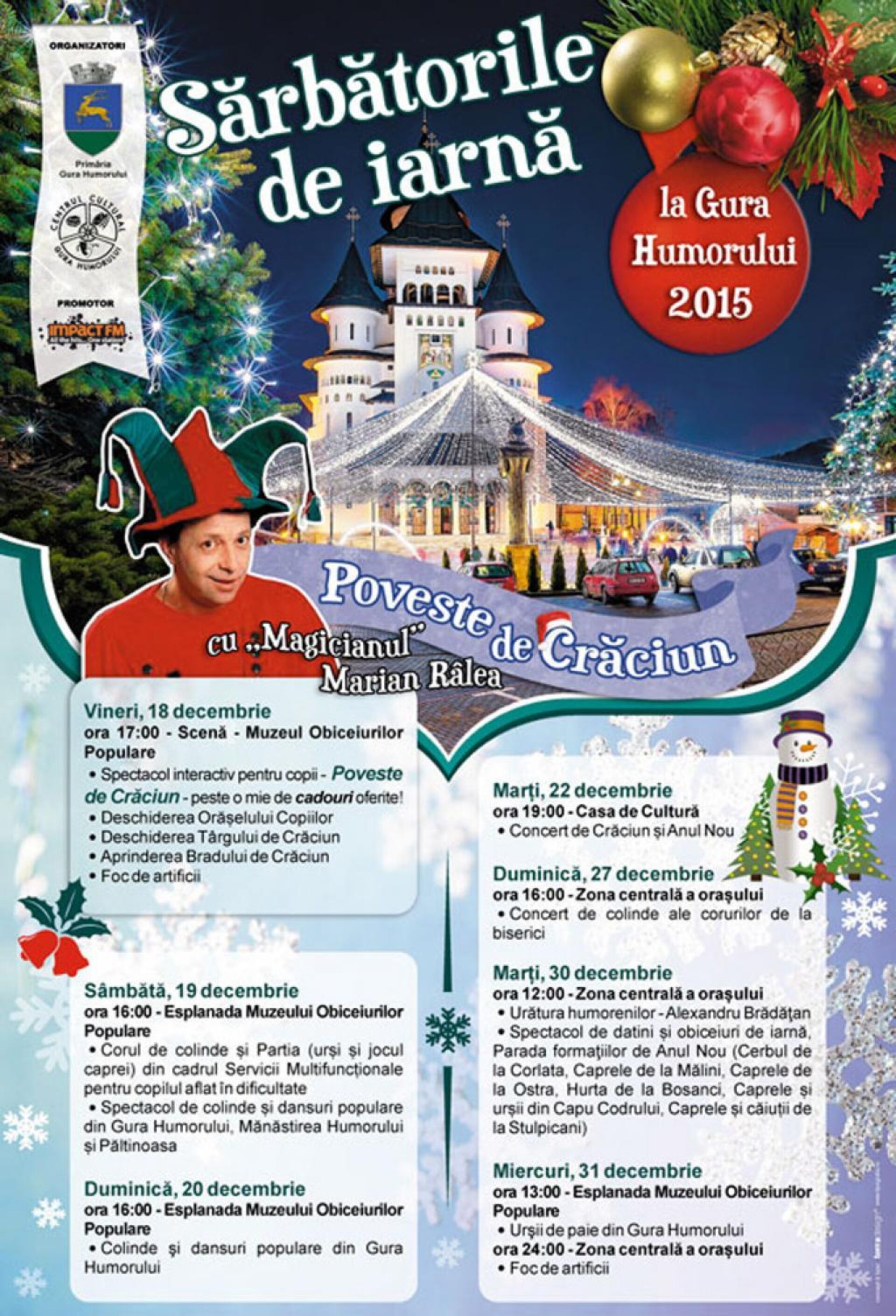 Manifestările organizate în Gura Humorului cu ocazia sărbătorilor de iarnă vor începe vineri, 18 decembrie a.c., în zona centrală a orașului. Începând cu ora 17:00, humorenii sunt invitați să fie prezenți la spectacolul interactiv pentru copii „Poveste de Crăciun” și la întâlnirea cu „magicianul” Marian Râlea, peste 1.000 de copii urmând să primească daruri. Tot atunci va avea loc și deschiderea oficială a Orășelului copiilor și a Târgului de Crăciun, precum și aprinderea luminilor din bradul din centrul orașului Gura Humorului. Seara de vineri se va încheia cu un foc de artificii. „Într-un peisaj sperăm cât mai hibernal și un oraș îmbrăcat în haine de sărbătoare, Primăria orașului Gura Humorului și Centrul Cultural prezintă, începând din data de 18 decembrie și până în ultima zi a anului, o ofertă bogată și variată de evenimente specifice acestei perioade. Astfel, vineri, 18 decembrie are loc, începând cu orele 17:00, inaugurarea Orășelului copiilor și a Târgului de Crăciun printr-un spectacol interactiv destinat mai ales copiilor, care îl are ca protagonist pe «Magicianul» Marian Râlea, însoțit de trupa sa. Ca de obicei, în zilele următoare, vor fi prezente pe scena de pe esplanada Muzeului formațiile care de ani buni îi bucură pe humoreni, dar și pe turiștii care ne vizitează orașul, apropiindu-i de atmosfera sărbătorilor de iarnă cu spectacole de colinde, dansuri, datini și jocuri tradiționale”, a spus primarul din Gura Humorului, Marius Ursaciuc.