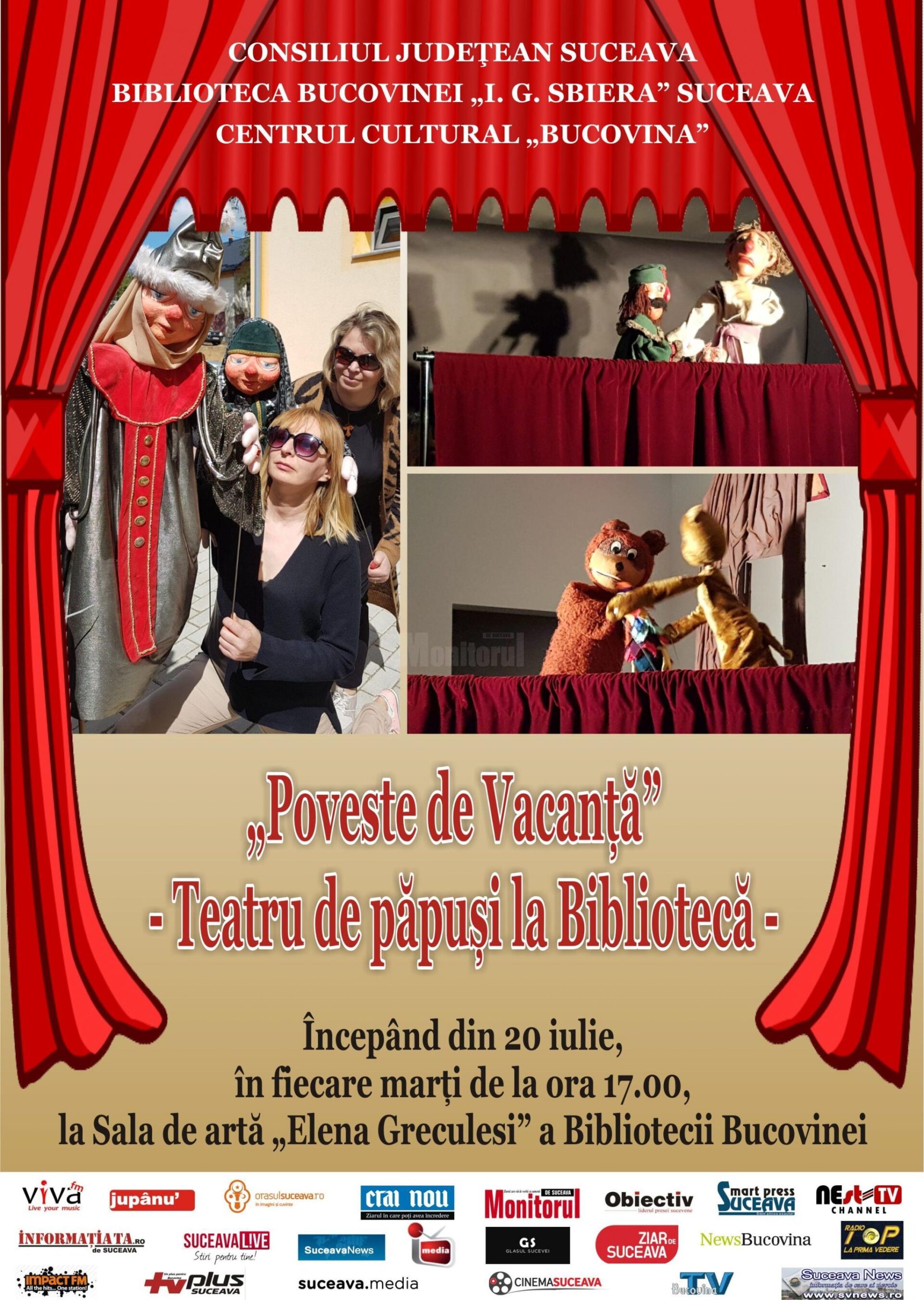 Biblioteca Bucovinei „I. G. Sbiera” și Centrul Cultural „Bucovina”, sub egida Consiliului Județean Suceava, invită copiii la teatru de păpuși. Poveste de Vacanță – Teatru de păpuși la Bibliotecă este un proiect ce se va derula pe perioada vacanței de vară. Astfel, în fiecare marți, începând din 20 iulie, cei mici vor fi așteptați de la ora 17.00 la Sala de artă „Elena Greculesi” a Bibliotecii Bucovinei pentru a participa la diverse spectacole susținute de trupa de teatru de păpuși a Centrului Cultural „Bucovina”.