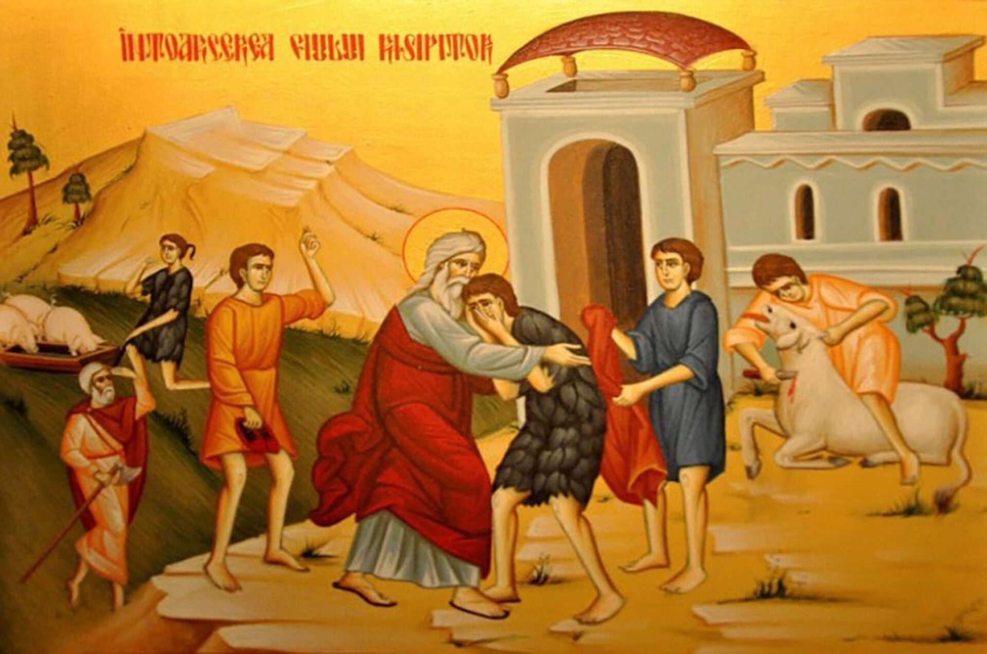 De multe ori tatăl și-a așteptat copilul în fapt de seară sau miez de noapte. De multe ori va fi privit în zare să vadă dacă nu cumva vine. Iar acum, când îl zărește de departe, în loc să-l mustre pentru fărădelegile lui, în loc să nu-l recunoască pentru urâțenia trupească și sufletească în care se întoarce acasă, în loc să-l alunge cu destulă bună dreptate, după câte a făcut, în loc de toate acestea, aleargă înaintea lui, nu se uită la starea în care se află fiul, se înduioșează atât de mult și îl îmbrățișează și căzând pe grumajii lui, îl sărută.