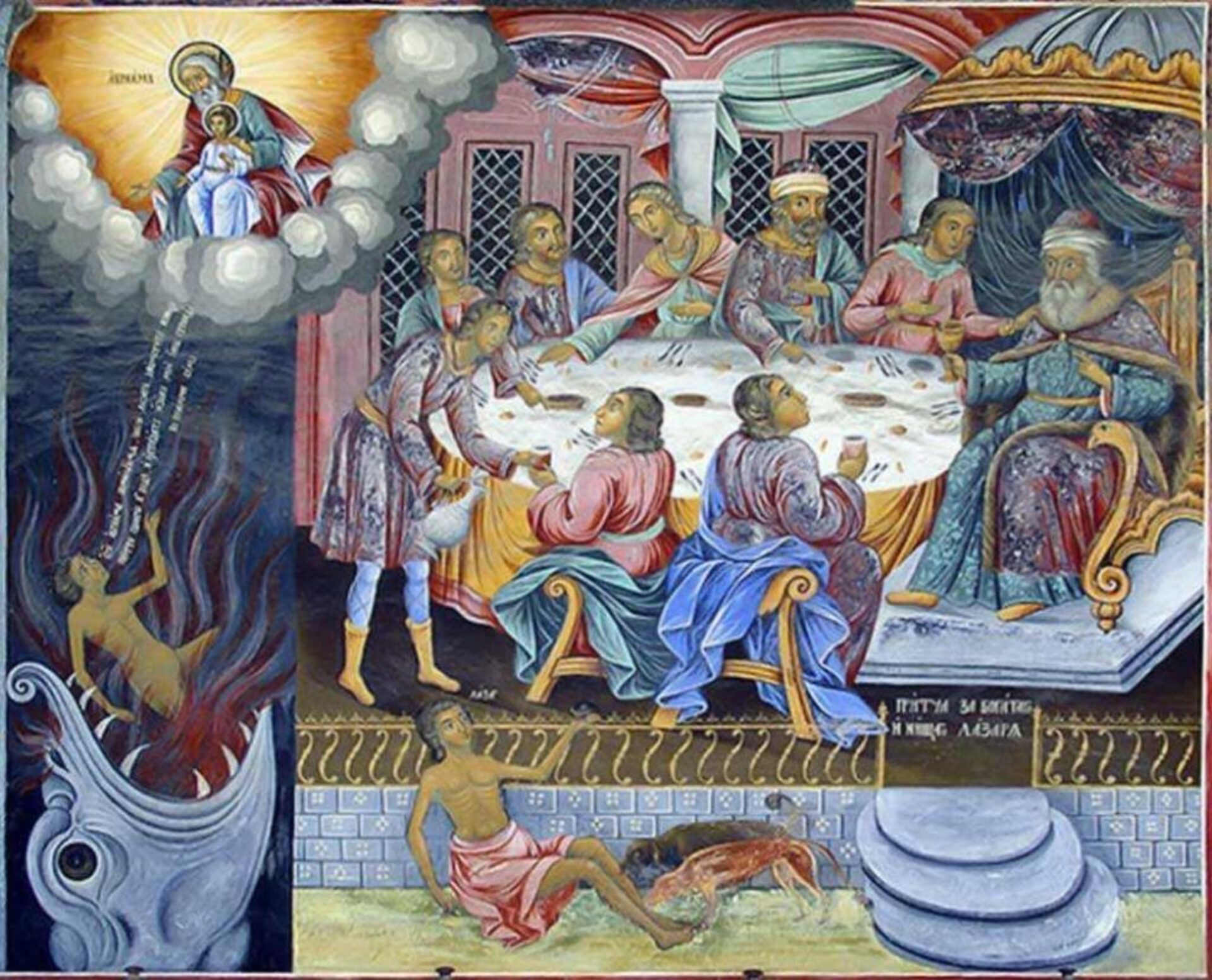 „Era un om bogat care se îmbrăca în porfiră și în vizon, în toate zilele veselindu-se în chip strălucit. Iar un sărac, pe nume Lazăr, zăcea în fața porții lui, plin de bube și ar fi poftit să se sature dintre cele ce cădeau de la masa bogatului; cu toate acestea, înșiși câinii, venind, îi lingeau bubele. Și a murit săracul și a fost dus de îngeri în sânul lui Avraam. Și a murit și bogatul și a fost îngropat. Și în iad, fiind el în chinuri, își ridică ochii și-l vede de departe pe Avraam, și pe Lazăr în sânul lui…”.