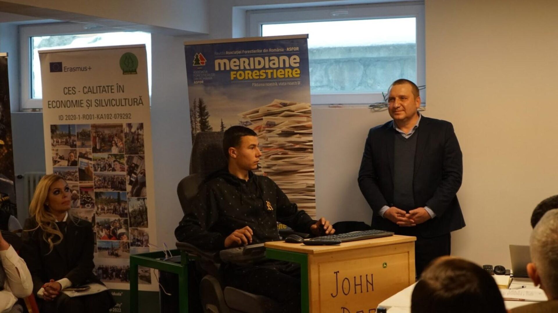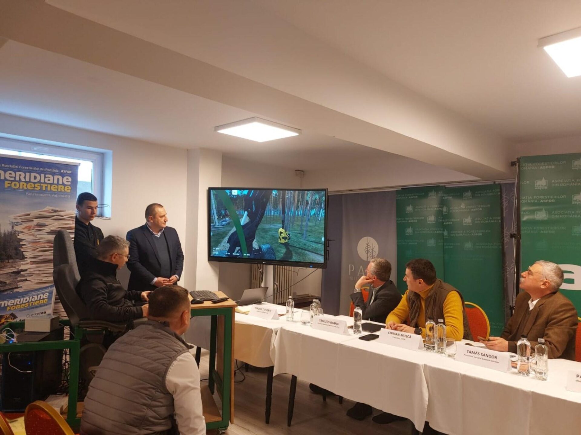 Prima parte a conferinței a fost dedicată liceelor și colegiilor silvice. Acestea pot achiziționa, prin PNRR, simulatoare de utilaje forestiere pentru pregătirea viitorilor operatori. Calificarea resursei umane este la fel de importantă ca dotarea cu utilaje noi. Reprezentanții Migab Forest au instalat un astfel de simulator în sala de conferință, iar participanții au avut ocazia să vadă cum funcționează acest echipament de pregătire.