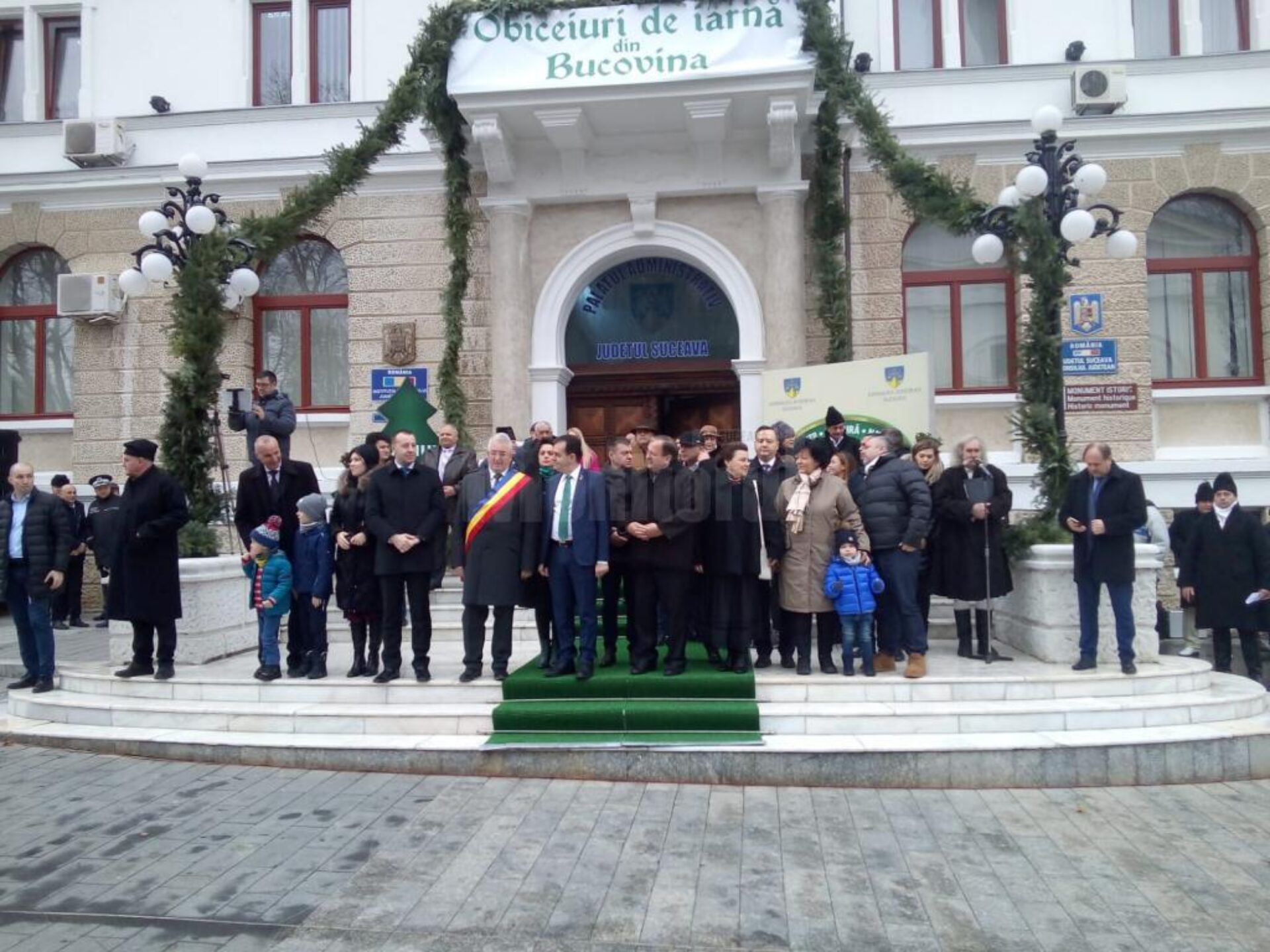 Premierul este pe treptele Palatului Administrativ din Suceava, alături de președintele Consiliului Județean Suceava, Gheorghe Flutur, primarul municipiului Suceava, Ion Lungu, prefectul Alexandru Moldovan, respectiv deputatul Ioan Balan, și așteaptă să vadă obiceiurile de iarnă din zonă.
