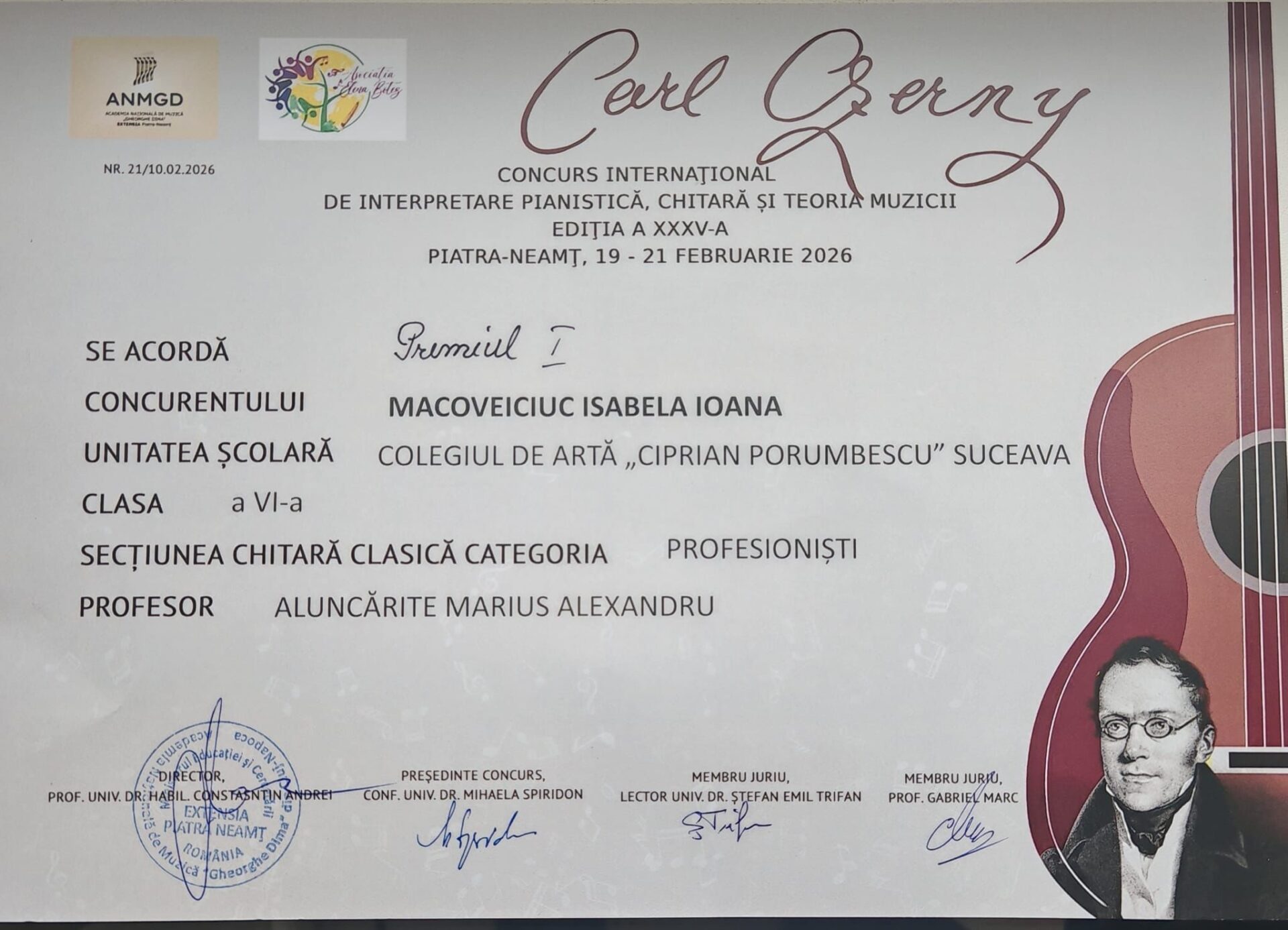 La Concursul Național de Interpretare pianistică “Carl Czerny” – secțiunea chitară, s-au întors cu premiul I elevii Tudor Chirilă, din clasa a VI-a, Isabela Macoveiciuc, din clasa a VI-a, și Andrei Cîrstean, din clasa a X-a, de la clasa de chitară a profesorului Marius-Alexandru Aluncărițe.