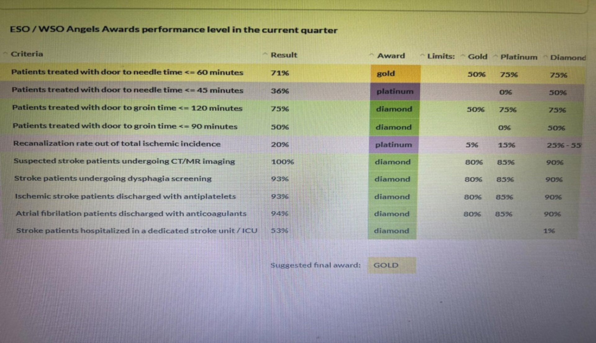 Medicul-șef al secției Neurologie din spitalul sucevean, dr. Daniela Neagu, a declarat că echipa pe care o coordonează este preocupată permanent de dezvoltarea resurselor în tratamentul accidentului vascular cerebral (AVC), prin utilizarea celor mai noi și performante metode de diagnostic, tratament și îngrijire a acestor pacienți. Dr. Neagu a spus că 71 la sută dintre pacienții evaluați de ESO au avut efectuată tromboliza la mai puțin de 60 de minute de la intrarea în UPU și la un singur pacient a fost depășit acest timp. Dacă și acesta ar fi fost trombolizat în mai puțin de o oră, procentul ar fi fost de 75 la sută, ceea ce ar fi făcut ca spitalul să primească premiul Angels statut Platină deoarece toți ceilalți indicatori au fost realizați pentru acest nivel.