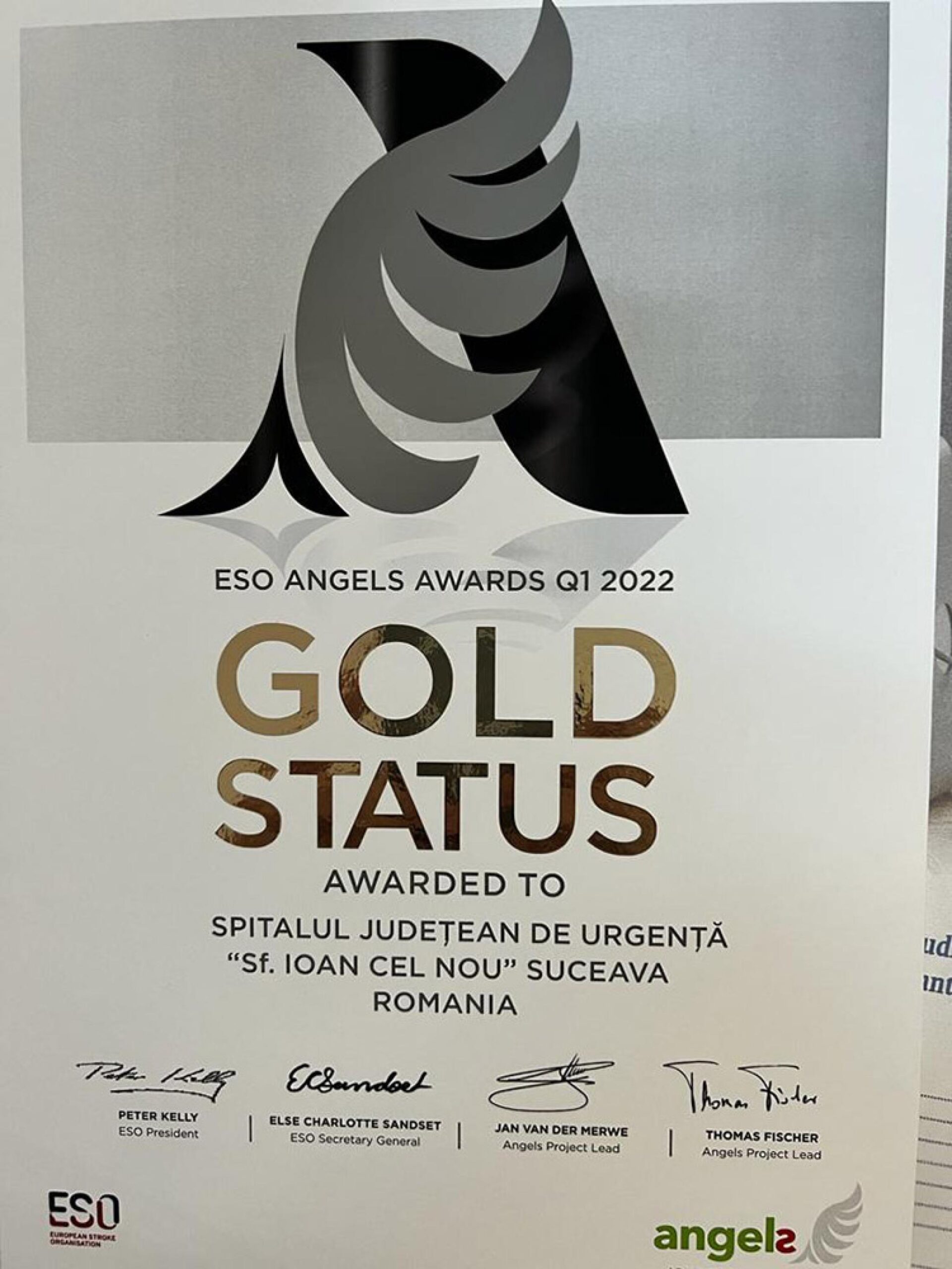 Din cele 44 de spitale din România care participă la programul național de tromboliză, în acest an 11 au primit acest premiu simbolic din partea ESO Angels: statut Gold au primit Spitalul de Urgență „Sf. Ioan cel Nou” Suceava, Spitalul Clinic Județean Oradea, Spitalul Universitar de Urgență București, Spitalul Clinic Județean Constanța, Spitalul Județean de Urgență Bacău și Spitalul Județean de Urgență Slatina. Cu Angels statut Platină au fost recompensate Spitalul Universitar de Urgență „Elias”, Spitalul Județean de Urgență „Dr. Fogolyán Kristóf” Sfântu Gheorghe, Spitalul Județean de Urgență Miercurea Ciuc, iar cu Diamant – Spitalul Clinic Județean de Urgență Cluj-Napoca și Spitalul Județean de Urgență Brașov.