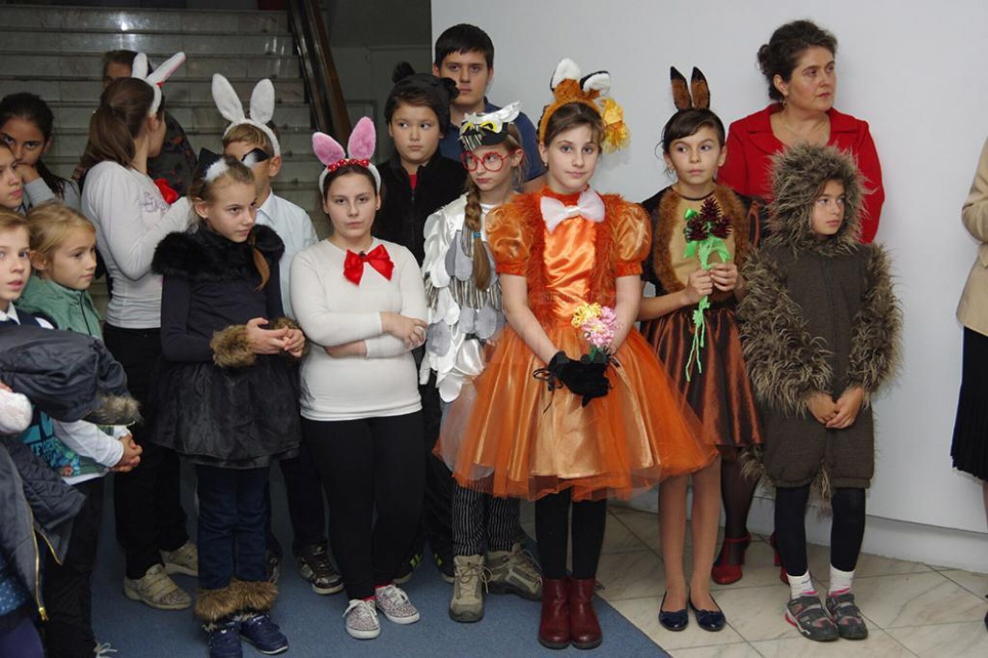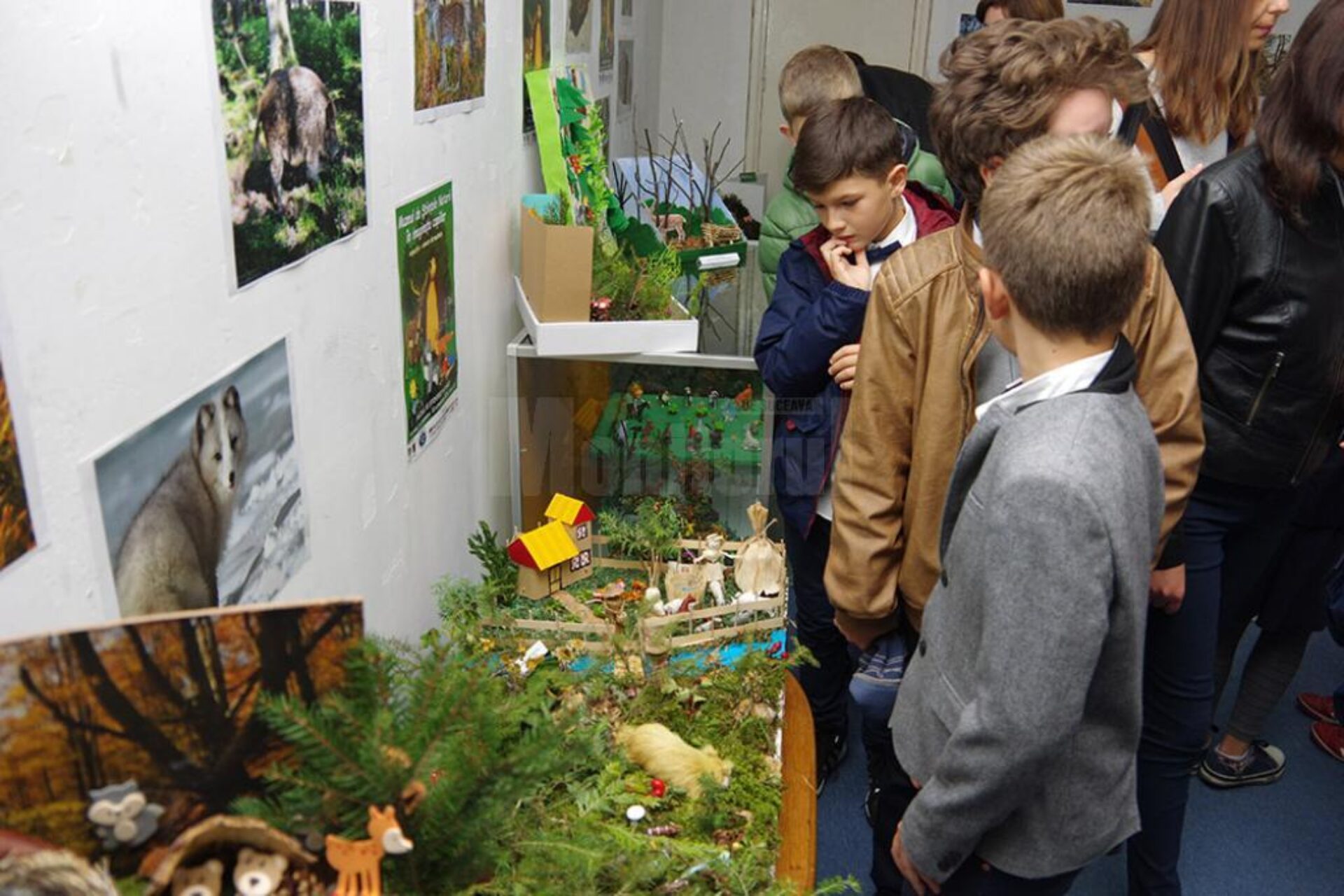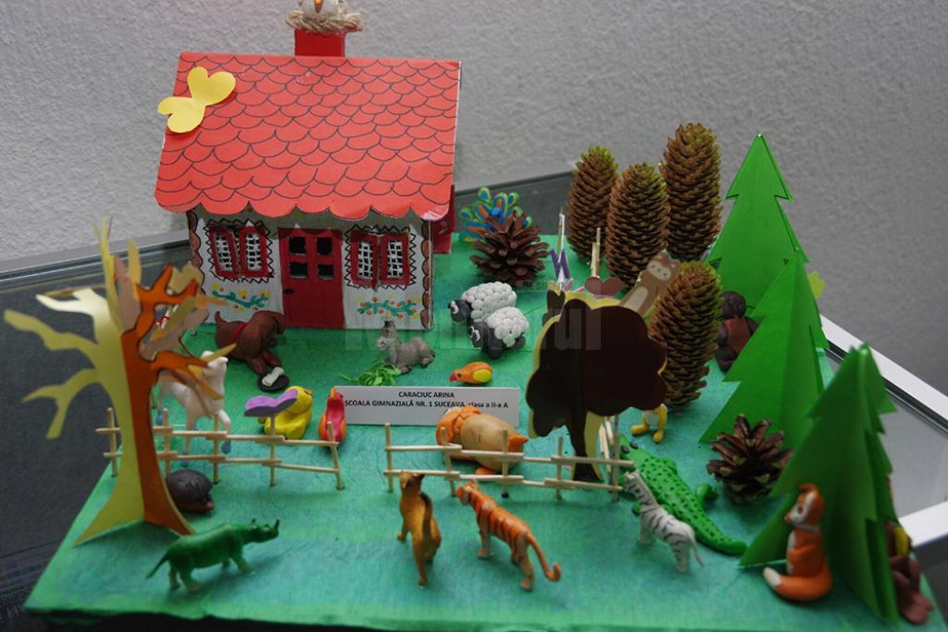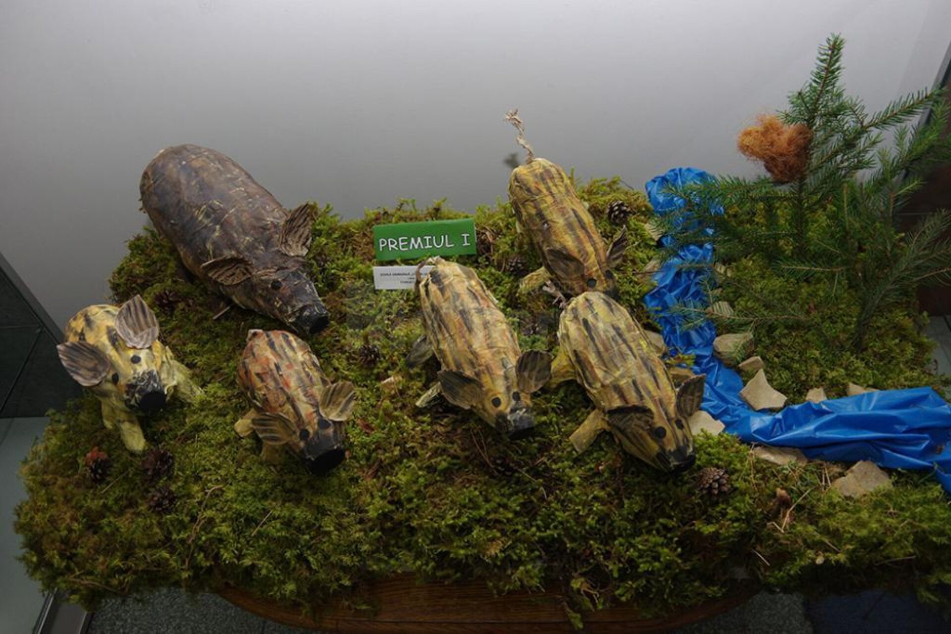 „Pentru a realiza macheta cu puii de mistreț am folosit mușchi de pădure, purceluși făcuți din sticlă, acoperită cu hârtie pictată. Am pus și ramuri de brad, iar râul este făcut dintr-o pungă albastră, iar pietrele sunt din natură”, ne-a spus Maria Laura Negru, de la Școala Gimnazială Putna. Pentru a intra în poveste, unii elevi au venit la vernisaj costumați în diferite personaje din pădure.