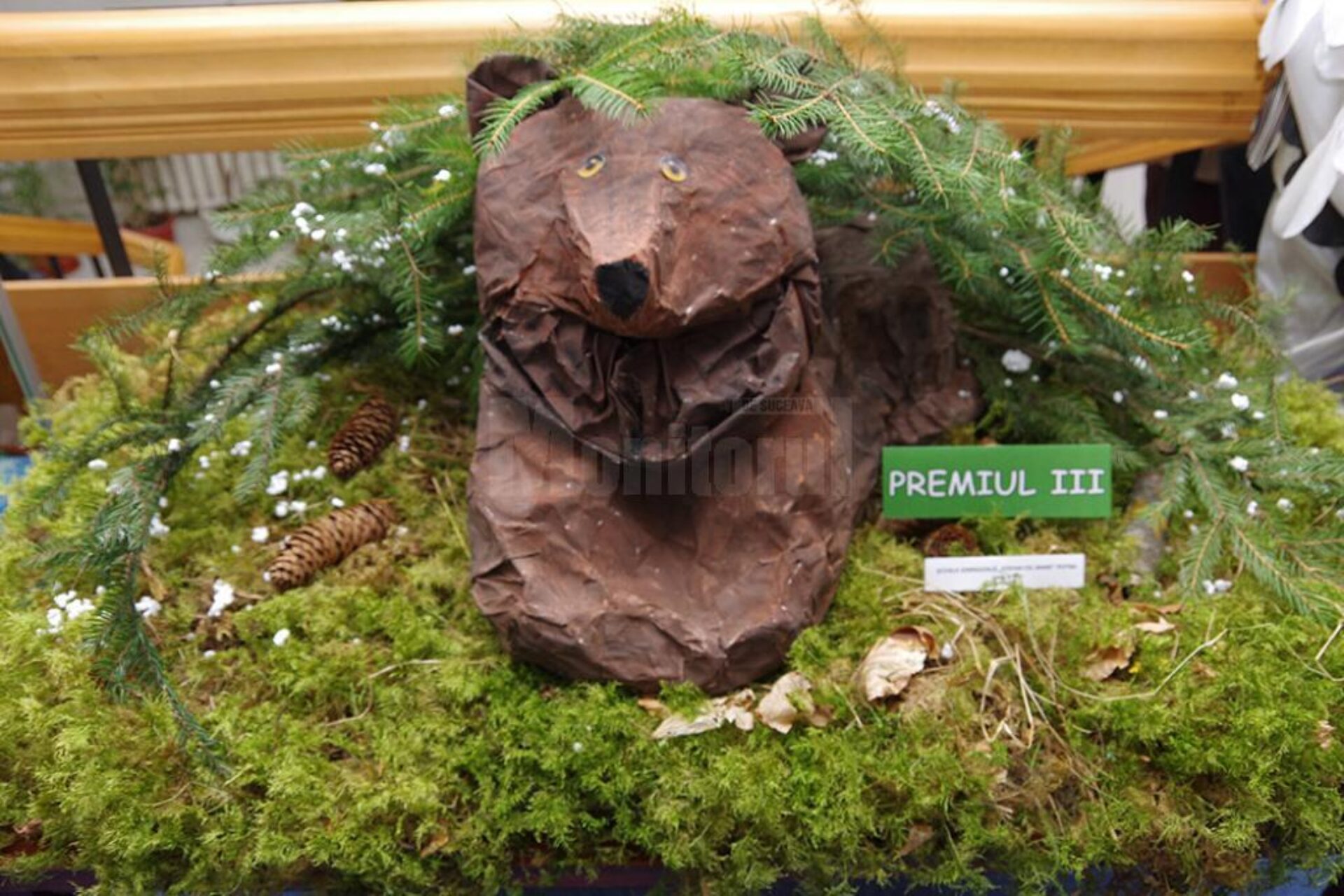 „Ce puteam alege mai frumos pentru toamnă decât cerbul, care este calm, maiestuos… Ca temă am ales bătaia cerbilor. Apoi, o altă machetă reflectă familia de mistreți, pentru că au un colorit aparte, iar copiii au spus că le inspiră bucurie, veselie. Au ales puii mistreților, pentru că tot ce este pui nu este fioros. Pentru noi, acest proiect a fost o încercare și, cred, și o reușită”, ne-a spus învățătoarea Mariana Aurica Chidoveț, de la Școala Gimnazială „Ștefan cel Mare” Putna, care a coordonat 19 elevi, premiați pentru machetele lor reușite.