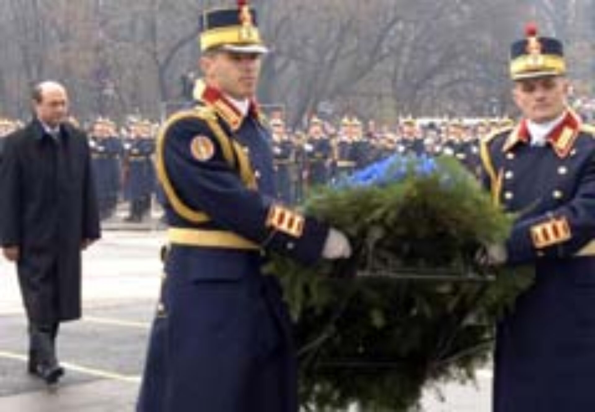În timp ce actualul președinte își făcea drum prin mulțimea îngrămădită pe șosea, pe trotuar trecea, aproape nebăgat în seamă, fostul președinte Emil Constantinescu. La parada militară a participat și celălat șef al statului din perioada post-revoluționară, Ion Iliescu, însă acesta s-a retras la încheierea programului oficial.