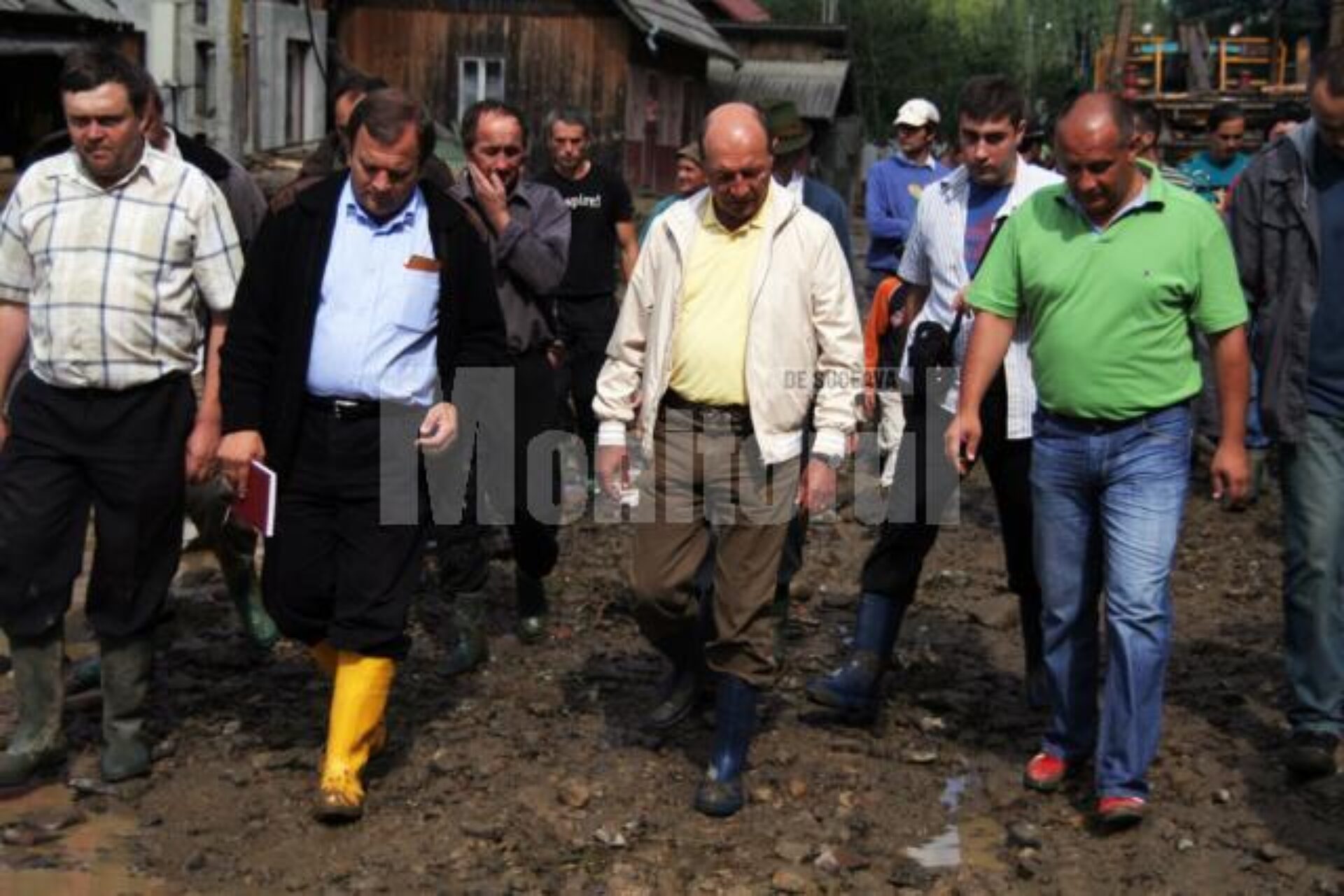 Însoțit de președintele Consiliului Județean Suceava, Gheorghe Flutur, și de prefectul Alexandru Băișanu, Băsescu a trecut printr-o livadă pentru a ajunge dincolo de zona în care a fost rupt drumul, după care s-a urcat într-o mașină de teren a unui localnic pentru a vedea casele inundate de viitura de sâmbătă după amiază.