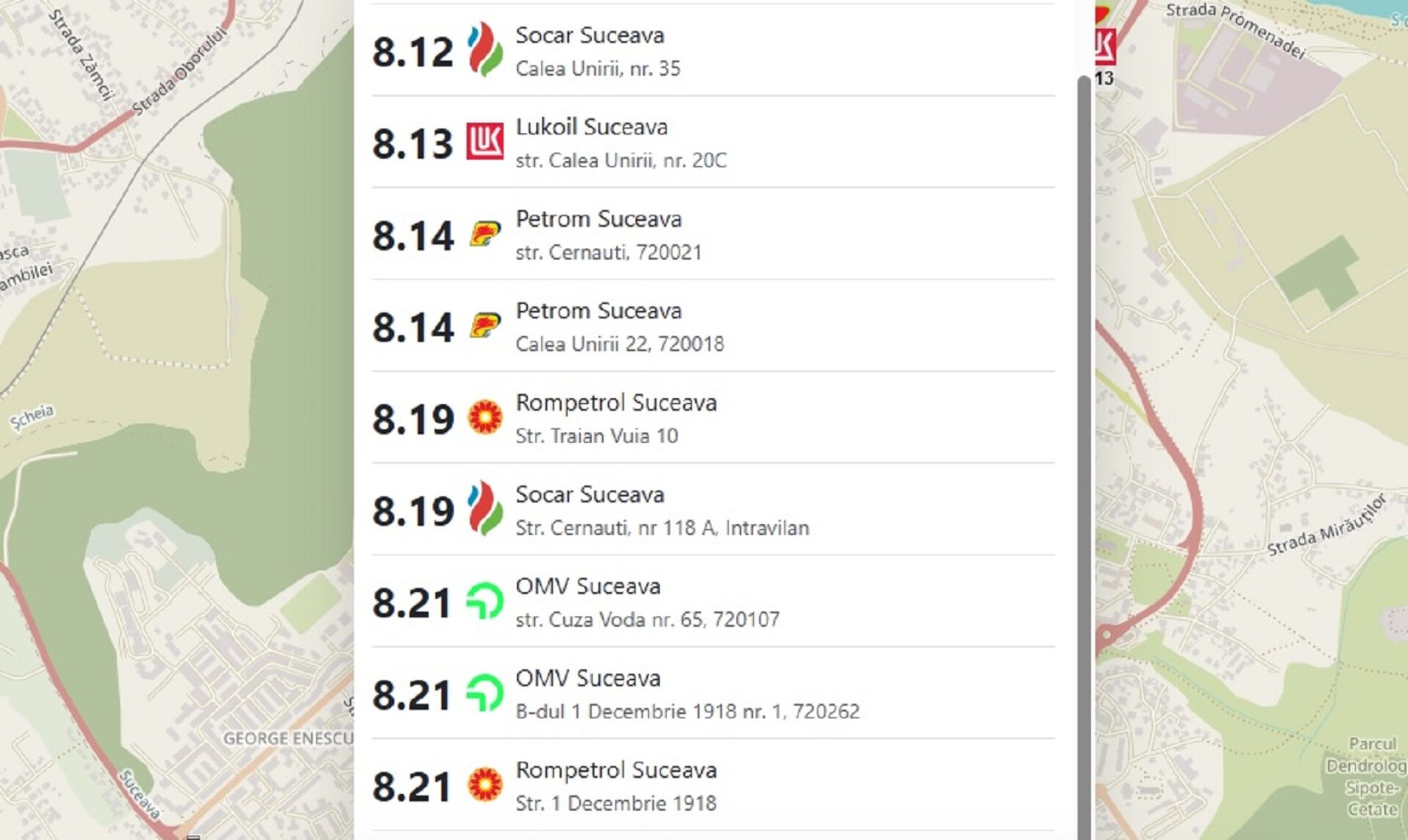OMV a crescut prețul la 8,21 lei/litru de câteva zile, iar Rompetrol avea prețuri de 8,21 lei/litru, respectiv 8,19 lei/litru la cele două stații din Suceava.