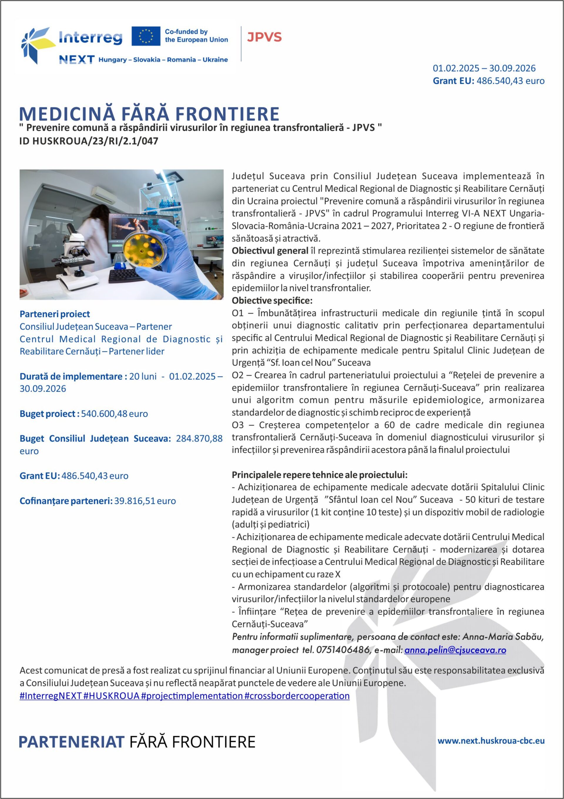 Județul Suceava prin Consiliul Județean Suceava implementează în parteneriat cu Centrul Medical Regional de Diagnostic și Reabilitare Cernăuți din Ucraina proiectul „Prevenire comună a răspândirii virusurilor în regiunea transfrontalieră – JPVS” în cadrul Programului Interreg VI-A NEXT Ungaria-Slovacia-România-Ucraina 2021 – 2027, Prioritatea 2 – O regiune de frontieră sănătoasă și atractivă.